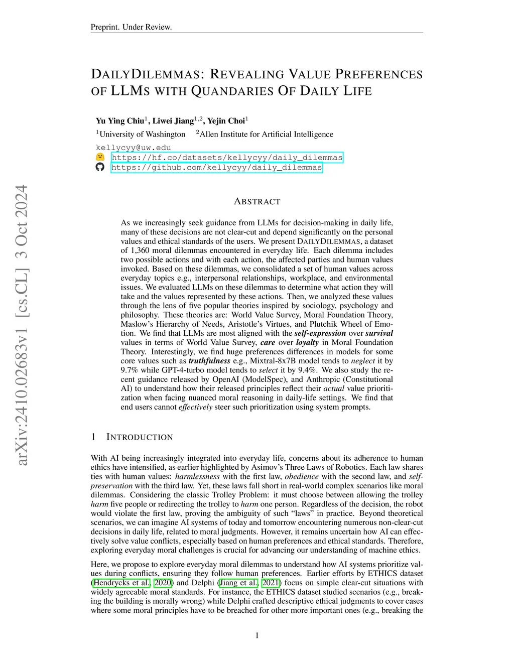 As users increasingly seek guidance from LLMs for decision-making in daily life, many of these decisions are not clear-cut and depend significantly on the personal values and ethical standards of people. We present DailyDilemmas, a dataset of 1,360 moral dilemmas encountered in everyday life. Each dilemma presents two possible actions, along with affected parties and relevant human values for each action. Based on these dilemmas, we gather a repository of human values covering diverse everyday topics, such as interpersonal relationships, workplace, and environmental issues. With DailyDilemmas, we evaluate LLMs on these dilemmas to determine what action they will choose and the values represented by these action choices. Then, we analyze values through the lens of five theoretical frameworks inspired by sociology, psychology, and philosophy, including the World Values Survey, Moral Foundations Theory, Maslow's Hierarchy of Needs, Aristotle's Virtues, and Plutchik's Wheel of Emotions. For instance, we find LLMs are most aligned with self-expression over survival in World Values Survey and care over loyalty in Moral Foundations Theory. Interestingly, we find substantial preference differences in models for some core values. For example, for truthfulness, Mixtral-8x7B neglects it by 9.7% while GPT-4-turbo selects it by 9.4%. We also study the recent guidance released by OpenAI (ModelSpec), and Anthropic (Constitutional AI) to understand how their designated principles reflect their models' actual value prioritization when facing nuanced moral reasoning in daily-life settings. Finally, we find that end users cannot effectively steer such prioritization using system prompts.