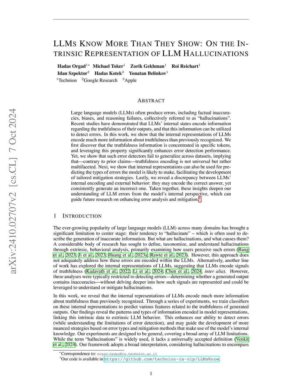 Large language models (LLMs) often produce errors, including factual inaccuracies, biases, and reasoning failures, collectively referred to as "hallucinations". Recent studies have demonstrated that LLMs' internal states encode information regarding the truthfulness of their outputs, and that this information can be utilized to detect errors. In this work, we show that the internal representations of LLMs encode much more information about truthfulness than previously recognized. We first discover that the truthfulness information is concentrated in specific tokens, and leveraging this property significantly enhances error detection performance. Yet, we show that such error detectors fail to generalize across datasets, implying that -- contrary to prior claims -- truthfulness encoding is not universal but rather multifaceted. Next, we show that internal representations can also be used for predicting the types of errors the model is likely to make, facilitating the development of tailored mitigation strategies. Lastly, we reveal a discrepancy between LLMs' internal encoding and external behavior: they may encode the correct answer, yet consistently generate an incorrect one. Taken together, these insights deepen our understanding of LLM errors from the model's internal perspective, which can guide future research on enhancing error analysis and mitigation.