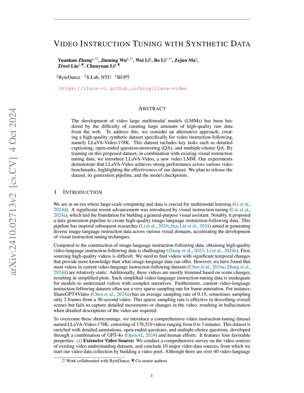 The development of video large multimodal models (LMMs) has been hindered by the difficulty of curating large amounts of high-quality raw data from the web. To address this, we propose an alternative approach by creating a high-quality synthetic dataset specifically for video instruction-following, namely LLaVA-Video-178K. This dataset includes key tasks such as detailed captioning, open-ended question-answering (QA), and multiple-choice QA. By training on this dataset, in combination with existing visual instruction tuning data, we introduce LLaVA-Video, a new video LMM. Our experiments demonstrate that LLaVA-Video achieves strong performance across various video benchmarks, highlighting the effectiveness of our dataset. We plan to release the dataset, its generation pipeline, and the model checkpoints.
