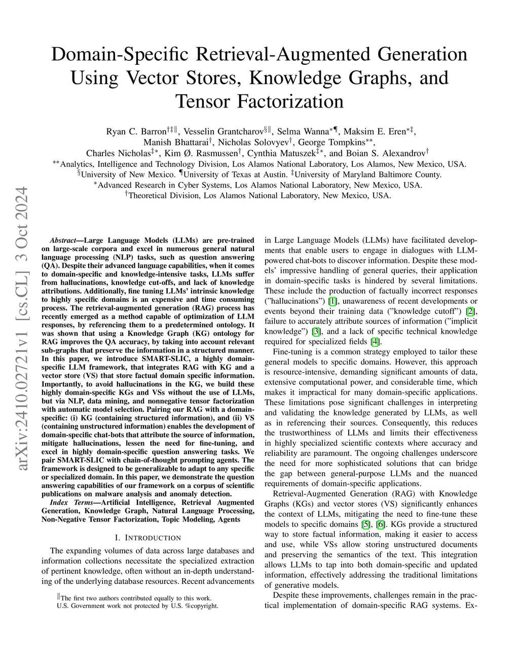 Large Language Models (LLMs) are pre-trained on large-scale corpora and excel in numerous general natural language processing (NLP) tasks, such as question answering (QA). Despite their advanced language capabilities, when it comes to domain-specific and knowledge-intensive tasks, LLMs suffer from hallucinations, knowledge cut-offs, and lack of knowledge attributions. Additionally, fine tuning LLMs' intrinsic knowledge to highly specific domains is an expensive and time consuming process. The retrieval-augmented generation (RAG) process has recently emerged as a method capable of optimization of LLM responses, by referencing them to a predetermined ontology. It was shown that using a Knowledge Graph (KG) ontology for RAG improves the QA accuracy, by taking into account relevant sub-graphs that preserve the information in a structured manner. In this paper, we introduce SMART-SLIC, a highly domain-specific LLM framework, that integrates RAG with KG and a vector store (VS) that store factual domain specific information. Importantly, to avoid hallucinations in the KG, we build these highly domain-specific KGs and VSs without the use of LLMs, but via NLP, data mining, and nonnegative tensor factorization with automatic model selection. Pairing our RAG with a domain-specific: (i) KG (containing structured information), and (ii) VS (containing unstructured information) enables the development of domain-specific chat-bots that attribute the source of information, mitigate hallucinations, lessen the need for fine-tuning, and excel in highly domain-specific question answering tasks. We pair SMART-SLIC with chain-of-thought prompting agents. The framework is designed to be generalizable to adapt to any specific or specialized domain. In this paper, we demonstrate the question answering capabilities of our framework on a corpus of scientific publications on malware analysis and anomaly detection.