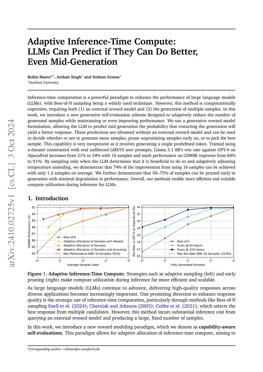 Inference-time computation is a powerful paradigm to enhance the performance of large language models (LLMs), with Best-of-N sampling being a widely used technique. However, this method is computationally expensive, requiring both (1) an external reward model and (2) the generation of multiple samples. In this work, we introduce a new generative self-evaluation scheme designed to adaptively reduce the number of generated samples while maintaining or even improving performance. We use a generative reward model formulation, allowing the LLM to predict mid-generation the probability that restarting the generation will yield a better response. These predictions are obtained without an external reward model and can be used to decide whether or not to generate more samples, prune unpromising samples early on, or to pick the best sample. This capability is very inexpensive as it involves generating a single predefined token. Trained using a dataset constructed with real unfiltered LMSYS user prompts, Llama 3.1 8B's win rate against GPT-4 on AlpacaEval increases from 21% to 34% with 16 samples and math performance on GSM8K improves from 84% to 91%. By sampling only when the LLM determines that it is beneficial to do so and adaptively adjusting temperature annealing, we demonstrate that 74% of the improvement from using 16 samples can be achieved with only 1.2 samples on average. We further demonstrate that 50-75% of samples can be pruned early in generation with minimal degradation in performance. Overall, our methods enable more efficient and scalable compute utilization during inference for LLMs.