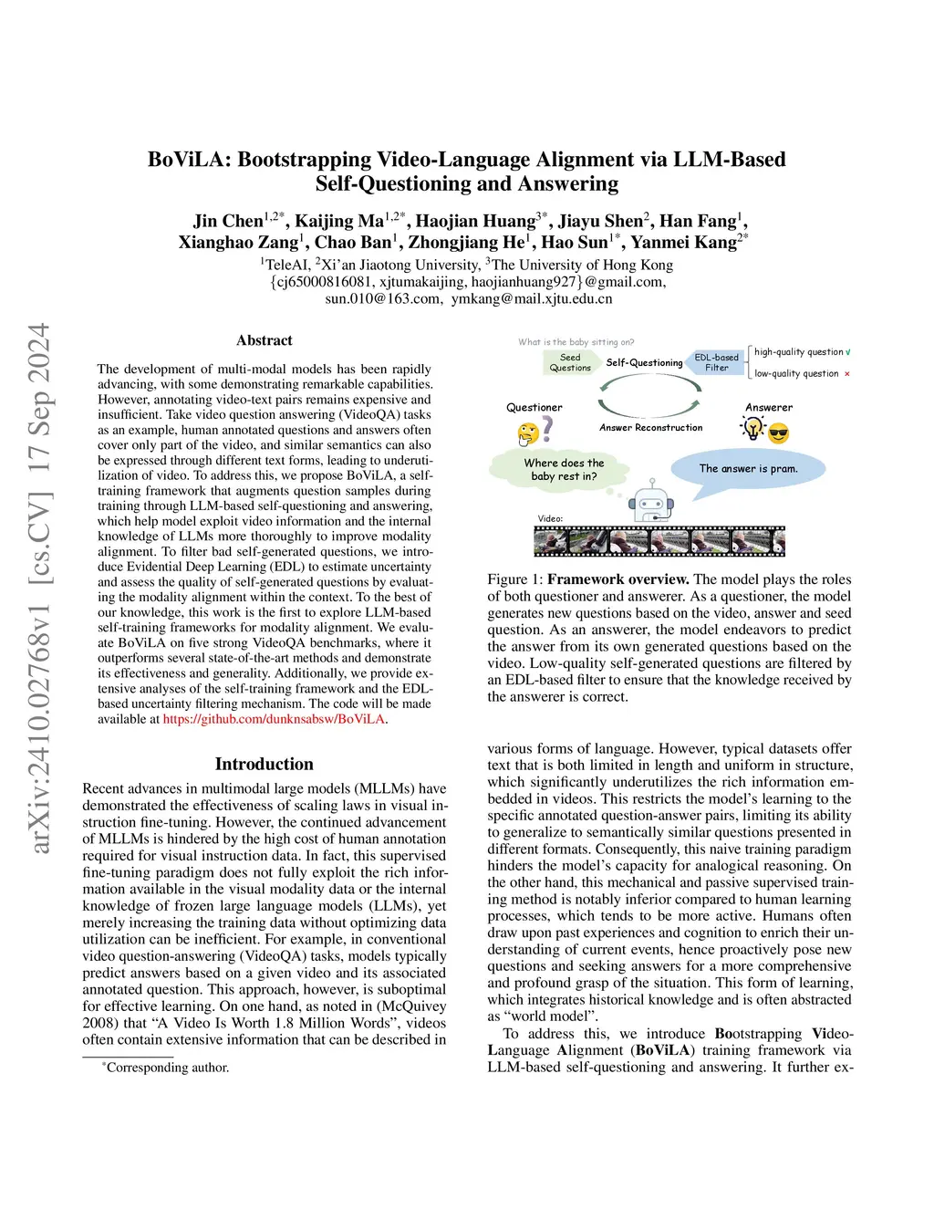 The development of multi-modal models has been rapidly advancing, with some demonstrating remarkable capabilities. However, annotating video-text pairs remains expensive and insufficient. Take video question answering (VideoQA) tasks as an example, human annotated questions and answers often cover only part of the video, since the corresponding text is often short and monotonous, leading to underutilization of video. To address this, we propose a Bootstrapping Video-Language Alignment framework (BoViLA), a self-training method that augments question samples during training process through LLM-based self-questioning and answering, which help model exploit video information and the internal knowledge of LLMs more thoroughly to improve modality alignment. However, low-quality self-generated questions may instead contaminate the performance, especially in the early stages of training, as we have observed in our experiments. To filter bad self-generated questions, we introduce Evidential Deep Learning (EDL) to estimate uncertainty and assess the quality of self-generated questions by evaluating the modality alignment within the context. To the best of our knowledge, this work is the first to explore LLM-based self-training frameworks for modality alignment. We evaluate BoViLA on five strong VideoQA benchmarks, where it outperforms several state-of-the-art methods and demonstrate its effectiveness and generality. Additionally, we provide extensive analyses of the self-training framework and the EDL-based uncertainty filtering mechanism. The code will be made available.