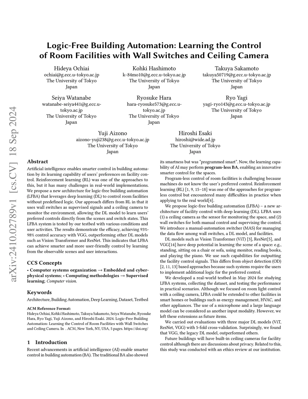 Artificial intelligence enables smarter control in building automation by its learning capability of users' preferences on facility control. Reinforcement learning (RL) was one of the approaches to this, but it has many challenges in real-world implementations. We propose a new architecture for logic-free building automation (LFBA) that leverages deep learning (DL) to control room facilities without predefined logic. Our approach differs from RL in that it uses wall switches as supervised signals and a ceiling camera to monitor the environment, allowing the DL model to learn users' preferred controls directly from the scenes and switch states. This LFBA system is tested by our testbed with various conditions and user activities. The results demonstrate the efficacy, achieving 93%-98% control accuracy with VGG, outperforming other DL models such as Vision Transformer and ResNet. This indicates that LFBA can achieve smarter and more user-friendly control by learning from the observable scenes and user interactions.