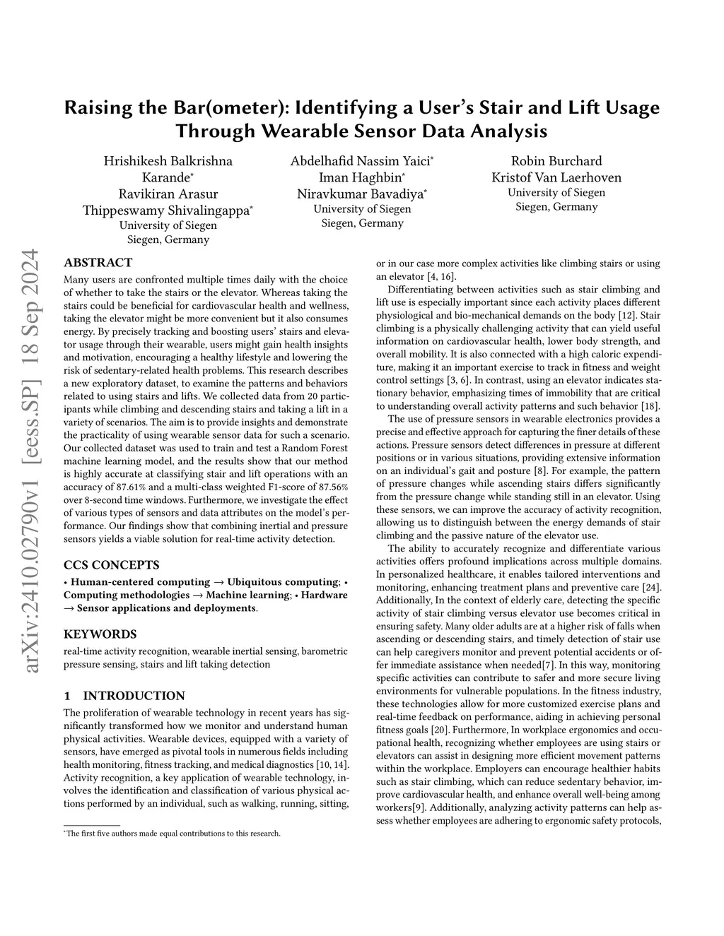 Many users are confronted multiple times daily with the choice of whether to take the stairs or the elevator. Whereas taking the stairs could be beneficial for cardiovascular health and wellness, taking the elevator might be more convenient but it also consumes energy. By precisely tracking and boosting users' stairs and elevator usage through their wearable, users might gain health insights and motivation, encouraging a healthy lifestyle and lowering the risk of sedentary-related health problems. This research describes a new exploratory dataset, to examine the patterns and behaviors related to using stairs and lifts. We collected data from 20 participants while climbing and descending stairs and taking a lift in a variety of scenarios. The aim is to provide insights and demonstrate the practicality of using wearable sensor data for such a scenario. Our collected dataset was used to train and test a Random Forest machine learning model, and the results show that our method is highly accurate at classifying stair and lift operations with an accuracy of 87.61% and a multi-class weighted F1-score of 87.56% over 8-second time windows. Furthermore, we investigate the effect of various types of sensors and data attributes on the model's performance. Our findings show that combining inertial and pressure sensors yields a viable solution for real-time activity detection.