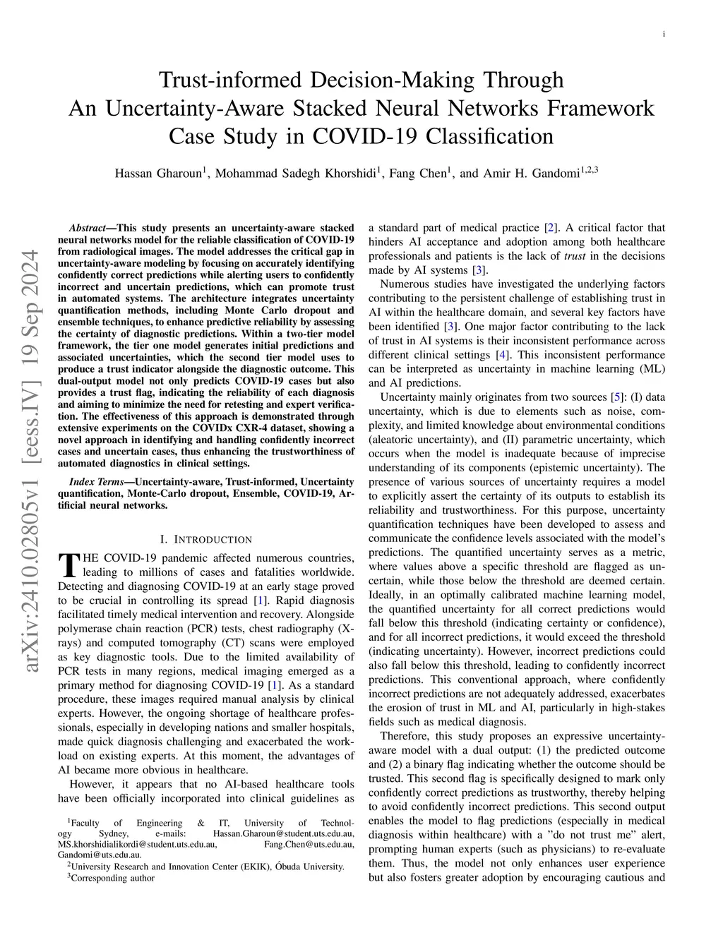 Reliable uncertainty quantification is critical in high-stakes applications, such as medical diagnosis, where confidently incorrect predictions can erode trust in automated decision-making systems. Traditional uncertainty quantification methods rely on a predefined confidence threshold to classify predictions as confident or uncertain. However, this approach assumes that predictions exceeding the threshold are trustworthy, while those below it are uncertain, without explicitly assessing the correctness of high-confidence predictions. As a result, confidently incorrect predictions may still occur, leading to misleading uncertainty assessments. To address this limitation, this study proposed an uncertainty-aware stacked neural network, which extends conventional uncertainty quantification by learning when predictions should be trusted. The framework consists of a two-tier model: the base model generates predictions with uncertainty estimates, while the meta-model learns to assign a trust flag, distinguishing confidently correct cases from those requiring expert review. The proposed approach is evaluated against the traditional threshold-based method across multiple confidence thresholds and pre-trained architectures using the COVIDx CXR-4 dataset. Results demonstrate that the proposed framework significantly reduces confidently incorrect predictions, offering a more trustworthy and efficient decision-support system for high-stakes domains.