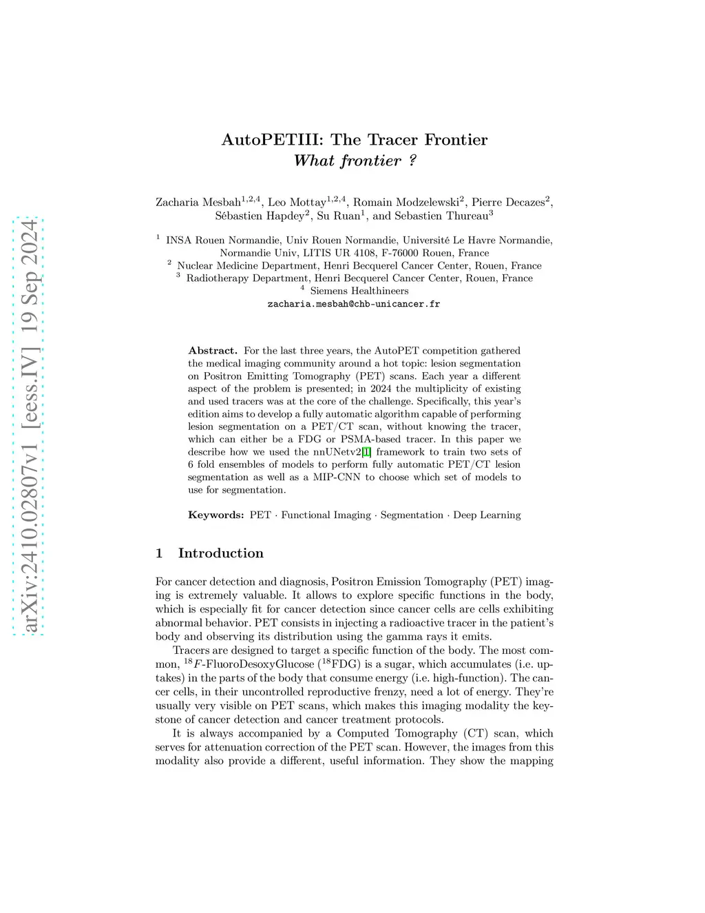 For the last three years, the AutoPET competition gathered the medical imaging community around a hot topic: lesion segmentation on Positron Emitting Tomography (PET) scans. Each year a different aspect of the problem is presented; in 2024 the multiplicity of existing and used tracers was at the core of the challenge. Specifically, this year's edition aims to develop a fully automatic algorithm capable of performing lesion segmentation on a PET/CT scan, without knowing the tracer, which can either be a FDG or PSMA-based tracer. In this paper we describe how we used the nnUNetv2 framework to train two sets of 6 fold ensembles of models to perform fully automatic PET/CT lesion segmentation as well as a MIP-CNN to choose which set of models to use for segmentation.