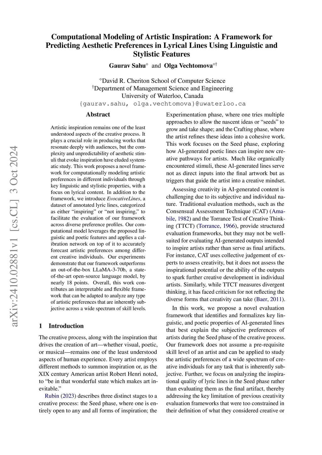Artistic inspiration remains one of the least understood aspects of the creative process. It plays a crucial role in producing works that resonate deeply with audiences, but the complexity and unpredictability of aesthetic stimuli that evoke inspiration have eluded systematic study. This work proposes a novel framework for computationally modeling artistic preferences in different individuals through key linguistic and stylistic properties, with a focus on lyrical content. In addition to the framework, we introduce \textit{EvocativeLines}, a dataset of annotated lyric lines, categorized as either "inspiring" or "not inspiring," to facilitate the evaluation of our framework across diverse preference profiles. Our computational model leverages the proposed linguistic and poetic features and applies a calibration network on top of it to accurately forecast artistic preferences among different creative individuals. Our experiments demonstrate that our framework outperforms an out-of-the-box LLaMA-3-70b, a state-of-the-art open-source language model, by nearly 18 points. Overall, this work contributes an interpretable and flexible framework that can be adapted to analyze any type of artistic preferences that are inherently subjective across a wide spectrum of skill levels.