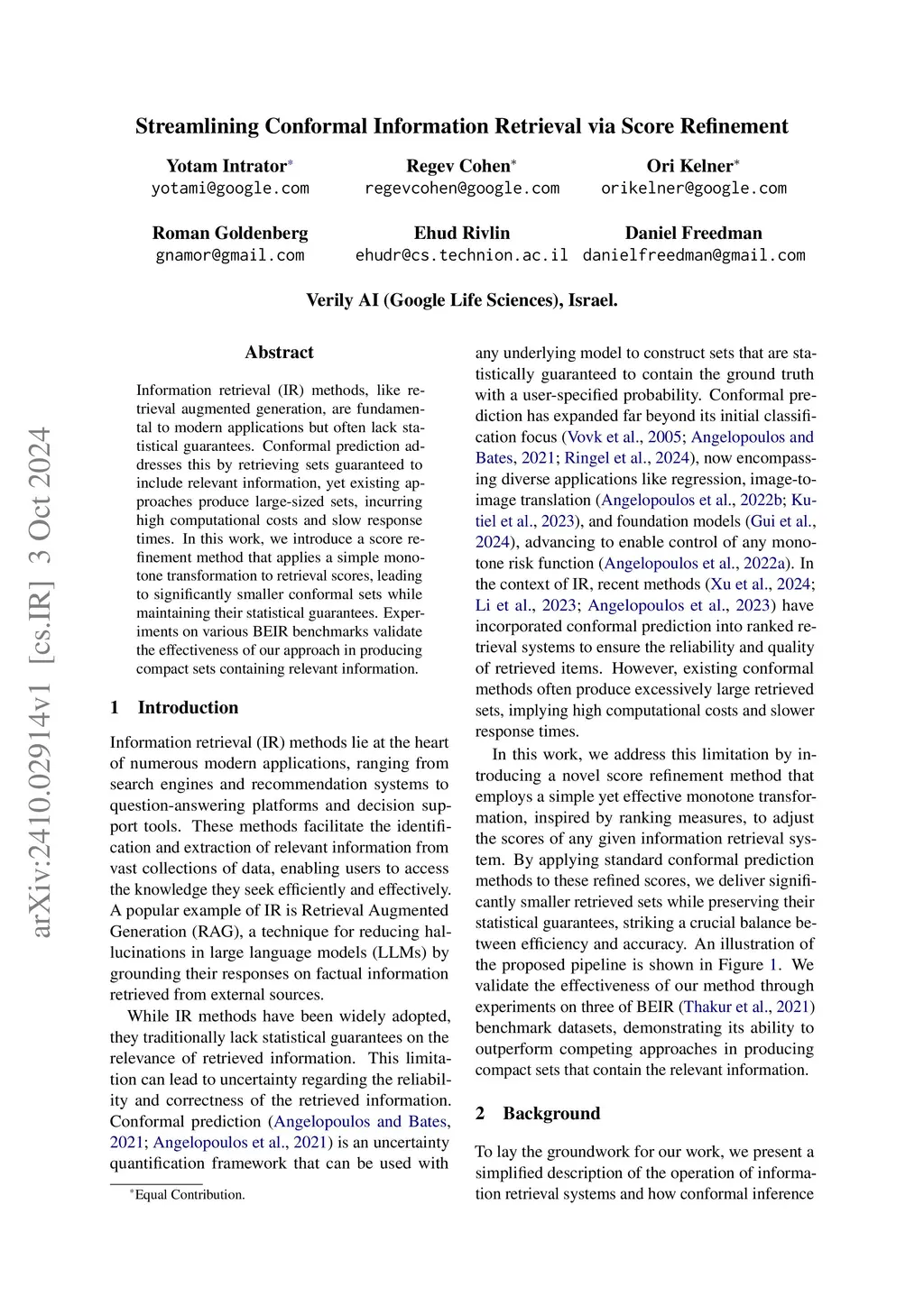 Information retrieval (IR) methods, like retrieval augmented generation, are fundamental to modern applications but often lack statistical guarantees. Conformal prediction addresses this by retrieving sets guaranteed to include relevant information, yet existing approaches produce large-sized sets, incurring high computational costs and slow response times. In this work, we introduce a score refinement method that applies a simple monotone transformation to retrieval scores, leading to significantly smaller conformal sets while maintaining their statistical guarantees. Experiments on various BEIR benchmarks validate the effectiveness of our approach in producing compact sets containing relevant information.