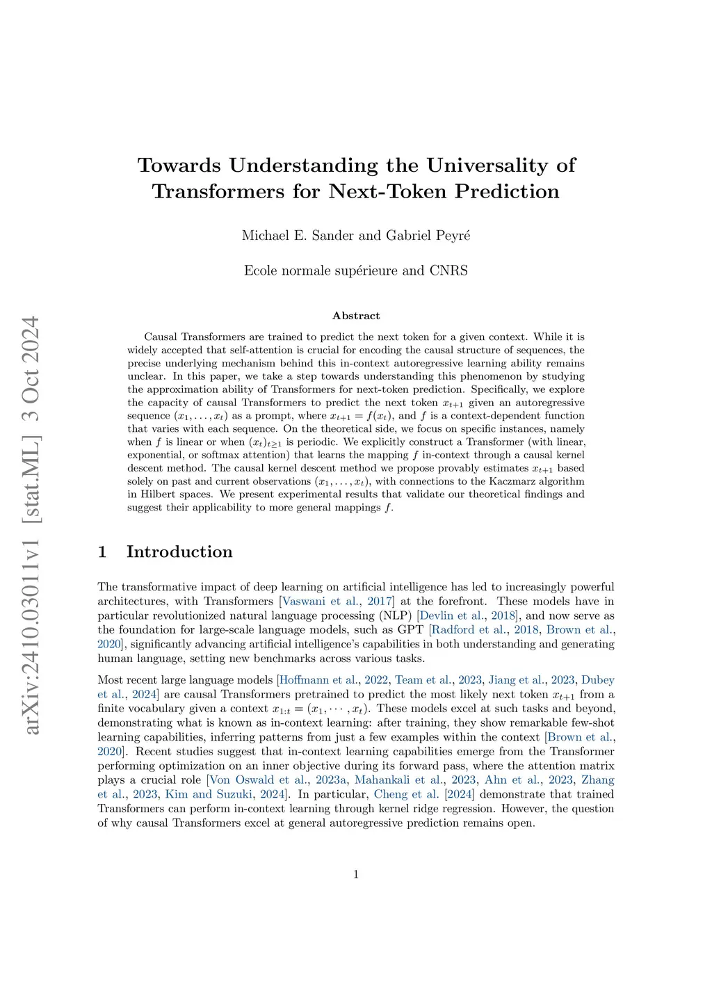 Causal Transformers are trained to predict the next token for a given context. While it is widely accepted that self-attention is crucial for encoding the causal structure of sequences, the precise underlying mechanism behind this in-context autoregressive learning ability remains unclear. In this paper, we take a step towards understanding this phenomenon by studying the approximation ability of Transformers for next-token prediction. Specifically, we explore the capacity of causal Transformers to predict the next token given an autoregressive sequence as a prompt, where $ x_{t+1} = f(x_t) $, and $ f $ is a context-dependent function that varies with each sequence. On the theoretical side, we focus on specific instances, namely when $ f $ is linear or when $ (x_t)_{t \geq 1} $ is periodic. We explicitly construct a Transformer (with linear, exponential, or softmax attention) that learns the mapping in-context through a causal kernel descent method. The causal kernel descent method we propose provably estimates $x_{t+1} $ based solely on past and current observations $ (x_1, \dots, x_t) $, with connections to the Kaczmarz algorithm in Hilbert spaces. We present experimental results that validate our theoretical findings and suggest their applicability to more general mappings .