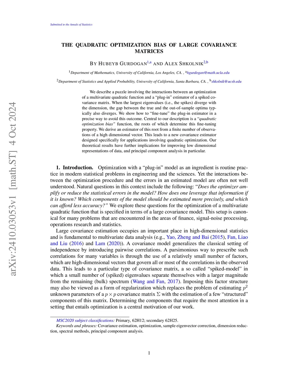 We describe a puzzle involving the interactions between an optimization of a multivariate quadratic function and a "plug-in" estimator of a spiked covariance matrix. When the largest eigenvalues (i.e., the spikes) diverge with the dimension, the gap between the true and the out-of-sample optima typically also diverges. We show how to "fine-tune" the plug-in estimator in a precise way to avoid this outcome. Central to our description is a "quadratic optimization bias" function, the roots of which determine this fine-tuning property. We derive an estimator of this root from a finite number of observations of a high dimensional vector. This leads to a new covariance estimator designed specifically for applications involving quadratic optimization. Our theoretical results have further implications for improving low dimensional representations of data, and principal component analysis in particular.