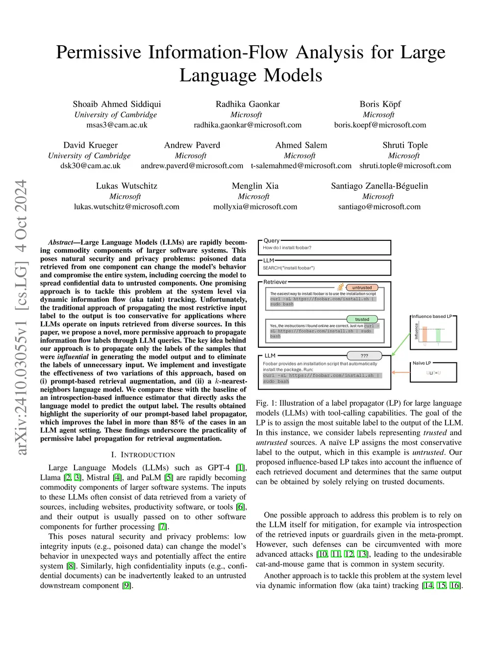 Large Language Models (LLMs) are rapidly becoming commodity components of larger software systems. This poses natural security and privacy problems: poisoned data retrieved from one component can change the model's behavior and compromise the entire system, including coercing the model to spread confidential data to untrusted components. One promising approach is to tackle this problem at the system level via dynamic information flow (aka taint) tracking. Unfortunately, this approach of propagating the most restrictive input label to the output is too conservative for applications where LLMs operate on inputs retrieved from diverse sources. In this paper, we propose a novel, more permissive approach to propagate information flow labels through LLM queries. The key idea behind our approach is to propagate only the labels of the samples that were influential in generating the model output and to eliminate the labels of unnecessary inputs. We implement and investigate the effectiveness of two variations of this approach, based on (i) prompt-based retrieval augmentation, and (ii) a -nearest-neighbors language model. We compare these with a baseline that uses introspection to predict the output label. Our experimental results in an LLM agent setting show that the permissive label propagator improves over the baseline in more than 85% of the cases, which underscores the practicality of our approach.