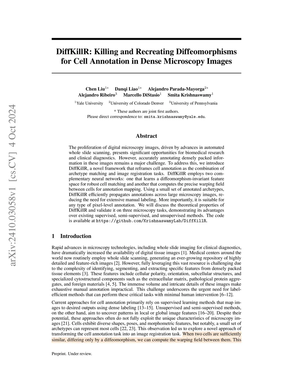 The proliferation of digital microscopy images, driven by advances in automated whole slide scanning, presents significant opportunities for biomedical research and clinical diagnostics. However, accurately annotating densely packed information in these images remains a major challenge. To address this, we introduce DiffKillR, a novel framework that reframes cell annotation as the combination of archetype matching and image registration tasks. DiffKillR employs two complementary neural networks: one that learns a diffeomorphism-invariant feature space for robust cell matching and another that computes the precise warping field between cells for annotation mapping. Using a small set of annotated archetypes, DiffKillR efficiently propagates annotations across large microscopy images, reducing the need for extensive manual labeling. More importantly, it is suitable for any type of pixel-level annotation. We will discuss the theoretical properties of DiffKillR and validate it on three microscopy tasks, demonstrating its advantages over existing supervised, semi-supervised, and unsupervised methods. The code is available atthis https URL.