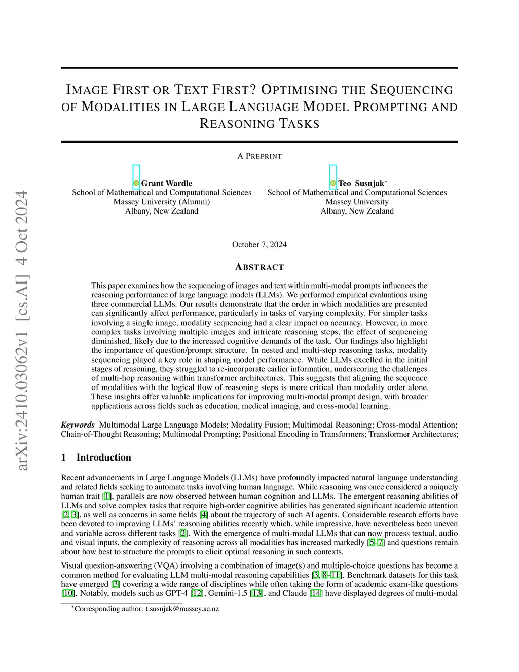 This paper examines how the sequencing of images and text within multi-modal prompts influences the reasoning performance of large language models (LLMs). We performed empirical evaluations using three commercial LLMs. Our results demonstrate that the order in which modalities are presented can significantly affect performance, particularly in tasks of varying complexity. For simpler tasks involving a single image, modality sequencing had a clear impact on accuracy. However, in more complex tasks involving multiple images and intricate reasoning steps, the effect of sequencing diminished, likely due to the increased cognitive demands of the task. Our findings also highlight the importance of question/prompt structure. In nested and multi-step reasoning tasks, modality sequencing played a key role in shaping model performance. While LLMs excelled in the initial stages of reasoning, they struggled to re-incorporate earlier information, underscoring the challenges of multi-hop reasoning within transformer architectures. This suggests that aligning the sequence of modalities with the logical flow of reasoning steps is more critical than modality order alone. These insights offer valuable implications for improving multi-modal prompt design, with broader applications across fields such as education, medical imaging, and cross-modal learning.