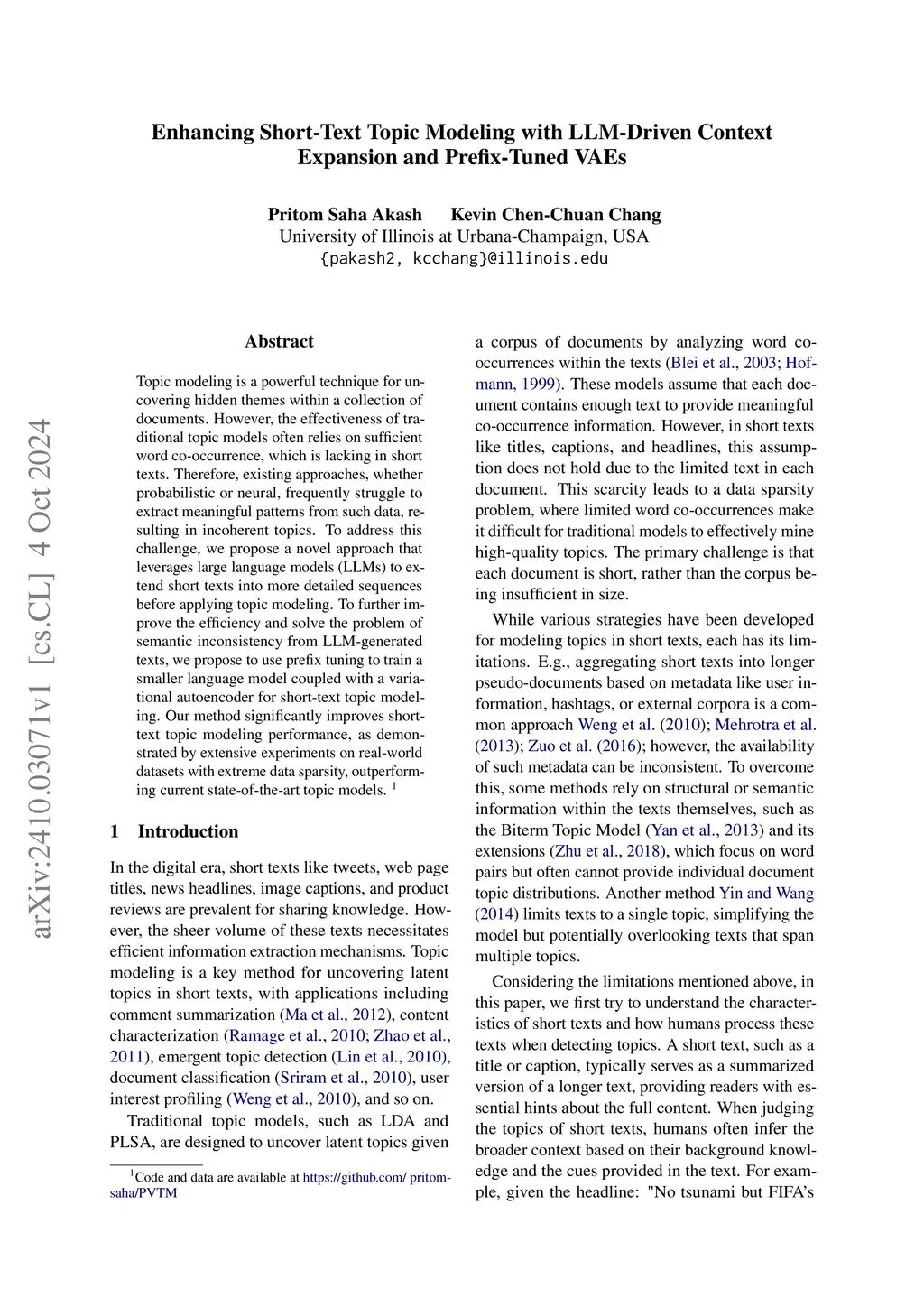 Topic modeling is a powerful technique for uncovering hidden themes within a collection of documents. However, the effectiveness of traditional topic models often relies on sufficient word co-occurrence, which is lacking in short texts. Therefore, existing approaches, whether probabilistic or neural, frequently struggle to extract meaningful patterns from such data, resulting in incoherent topics. To address this challenge, we propose a novel approach that leverages large language models (LLMs) to extend short texts into more detailed sequences before applying topic modeling. To further improve the efficiency and solve the problem of semantic inconsistency from LLM-generated texts, we propose to use prefix tuning to train a smaller language model coupled with a variational autoencoder for short-text topic modeling. Our method significantly improves short-text topic modeling performance, as demonstrated by extensive experiments on real-world datasets with extreme data sparsity, outperforming current state-of-the-art topic models.