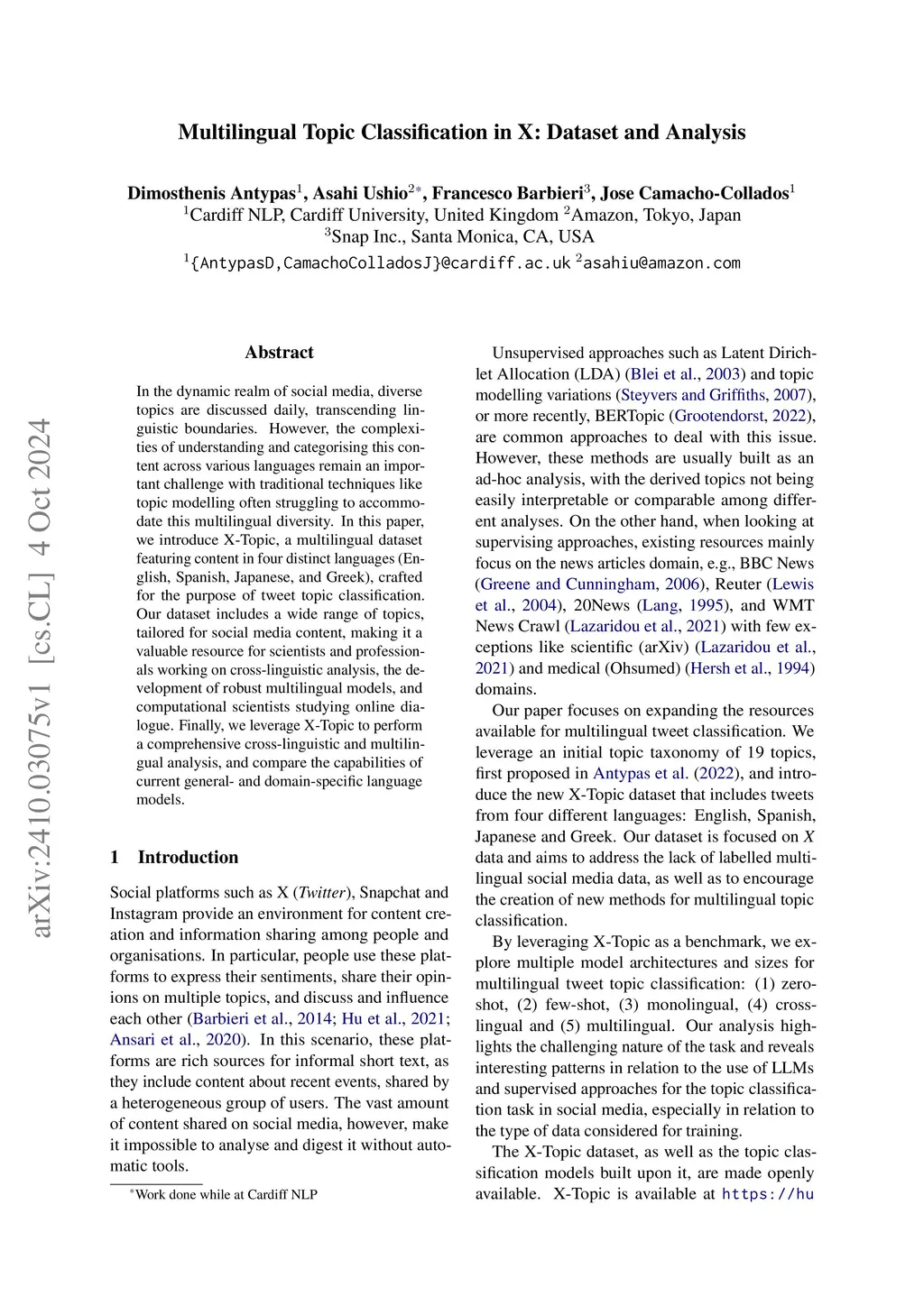 In the dynamic realm of social media, diverse topics are discussed daily, transcending linguistic boundaries. However, the complexities of understanding and categorising this content across various languages remain an important challenge with traditional techniques like topic modelling often struggling to accommodate this multilingual diversity. In this paper, we introduce X-Topic, a multilingual dataset featuring content in four distinct languages (English, Spanish, Japanese, and Greek), crafted for the purpose of tweet topic classification. Our dataset includes a wide range of topics, tailored for social media content, making it a valuable resource for scientists and professionals working on cross-linguistic analysis, the development of robust multilingual models, and computational scientists studying online dialogue. Finally, we leverage X-Topic to perform a comprehensive cross-linguistic and multilingual analysis, and compare the capabilities of current general- and domain-specific language models.