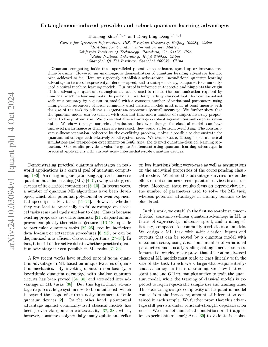 Quantum computing holds unparalleled potentials to enhance machine learning. However, a demonstration of quantum learning advantage has not been achieved so far. We make a step forward by rigorously establishing a noise-robust, unconditional quantum learning advantage in expressivity, inference speed, and training efficiency, compared to commonly-used classical models. Our proof is information-theoretic and pinpoints the origin of this advantage: entanglement can be used to reduce the communication required by non-local tasks. In particular, we design a task that can be solved with certainty by quantum models with a constant number of parameters using entanglement, whereas commonly-used classical models must scale linearly to achieve a larger-than-exponentially-small accuracy. We show that the quantum model is trainable with constant resources and robust against constant noise. Through numerical and trapped-ion experiments on IonQ Aria, we demonstrate the desired advantage. Our results provide valuable guidance for demonstrating quantum learning advantages with current noisy intermediate-scale devices.