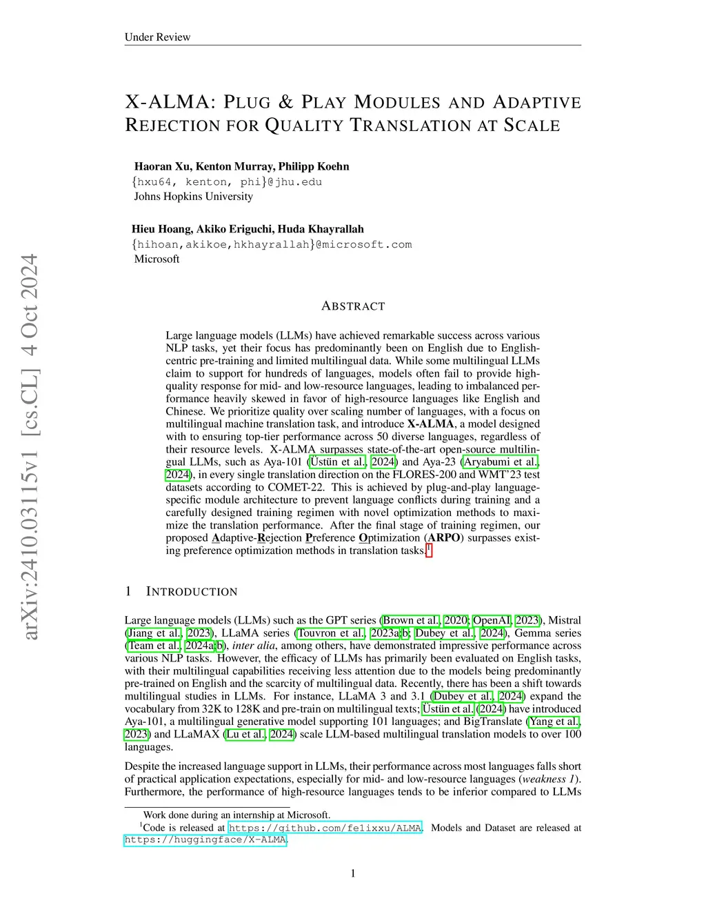 Large language models (LLMs) have achieved remarkable success across various NLP tasks with a focus on English due to English-centric pre-training and limited multilingual data. In this work, we focus on the problem of translation, and while some multilingual LLMs claim to support for hundreds of languages, models often fail to provide high-quality responses for mid- and low-resource languages, leading to imbalanced performance heavily skewed in favor of high-resource languages. We introduce **X-ALMA**, a model designed to ensure top-tier performance across 50 diverse languages, regardless of their resource levels. X-ALMA surpasses state-of-the-art open-source multilingual LLMs, such as Aya-101 and Aya-23, in every single translation direction on the FLORES-200 and WMT'23 test datasets according to COMET-22. This is achieved by plug-and-play language-specific module architecture to prevent language conflicts during training and a carefully designed training regimen with novel optimization methods to maximize the translation performance. After the final stage of training regimen, our proposed **A**daptive **R**ejection **P**reference **O**ptimization (**ARPO**) surpasses existing preference optimization methods in translation tasks.