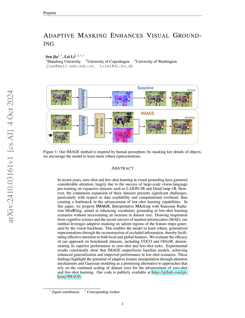 In recent years, zero-shot and few-shot learning in visual grounding have garnered considerable attention, largely due to the success of large-scale vision-language pre-training on expansive datasets such as LAION-5B and DataComp-1B. However, the continuous expansion of these datasets presents significant challenges, particularly with respect to data availability and computational overhead, thus creating a bottleneck in the advancement of low-shot learning capabilities. In this paper, we propose IMAGE, Interpretative MAsking with Gaussian radiation modEling, aimed at enhancing vocabulary grounding in low-shot learning scenarios without necessitating an increase in dataset size. Drawing inspiration from cognitive science and the recent success of masked autoencoders (MAE), our method leverages adaptive masking on salient regions of the feature maps generated by the vision backbone. This enables the model to learn robust, generalized representations through the reconstruction of occluded information, thereby facilitating effective attention to both local and global features. We evaluate the efficacy of our approach on benchmark datasets, including COCO and ODinW, demonstrating its superior performance in zero-shot and few-shot tasks. Experimental results consistently show that IMAGE outperforms baseline models, achieving enhanced generalization and improved performance in low-shot scenarios. These findings highlight the potential of adaptive feature manipulation through attention mechanisms and Gaussian modeling as a promising alternative to approaches that rely on the continual scaling of dataset sizes for the advancement of zero-shot and few-shot learning. Our code is publicly available at https://github.com/git-lenny/IMAGE.