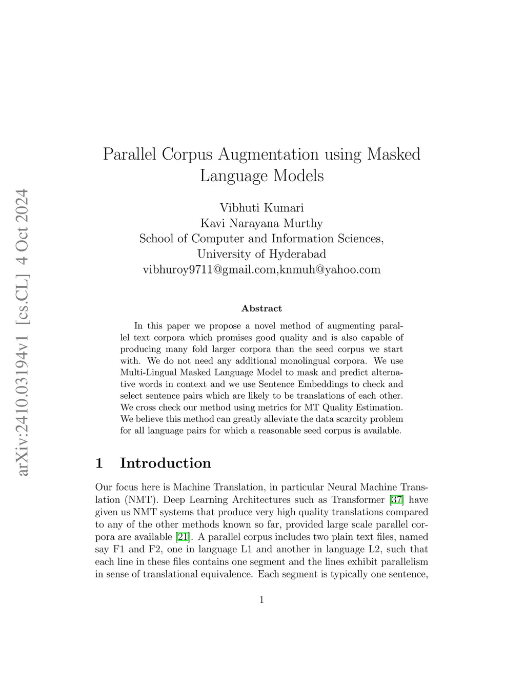In this paper we propose a novel method of augmenting parallel text corpora which promises good quality and is also capable of producing many fold larger corpora than the seed corpus we start with. We do not need any additional monolingual corpora. We use Multi-Lingual Masked Language Model to mask and predict alternative words in context and we use Sentence Embeddings to check and select sentence pairs which are likely to be translations of each other. We cross check our method using metrics for MT Quality Estimation. We believe this method can greatly alleviate the data scarcity problem for all language pairs for which a reasonable seed corpus is available.