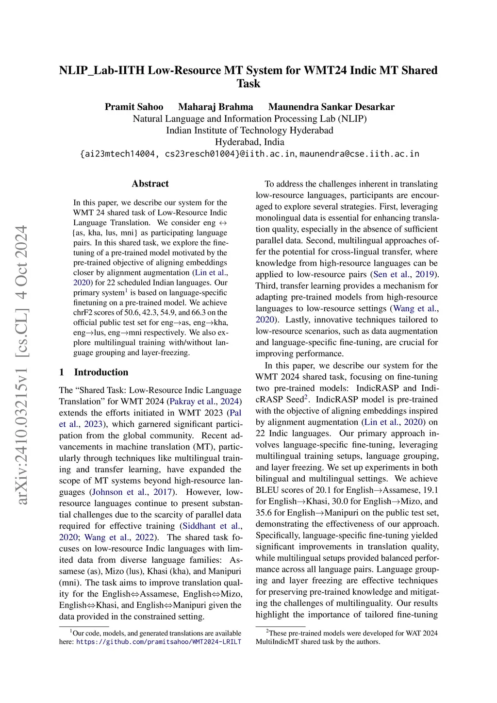 In this paper, we describe our system for the WMT 24 shared task of Low-Resource Indic Language Translation. We consider eng {as, kha, lus, mni} as participating language pairs. In this shared task, we explore the finetuning of a pre-trained model motivated by the pre-trained objective of aligning embeddings closer by alignment augmentation \cite{lin-etal-2020-pre} for 22 scheduled Indian languages. Our primary system is based on language-specific finetuning on a pre-trained model. We achieve chrF2 scores of 50.6, 42.3, 54.9, and 66.3 on the official public test set for engas, engkha, englus, engmni respectively. We also explore multilingual training with/without language grouping and layer-freezing. Our code, models, and generated translations are available here: https://github.com/pramitsahoo/WMT2024-LRILT.