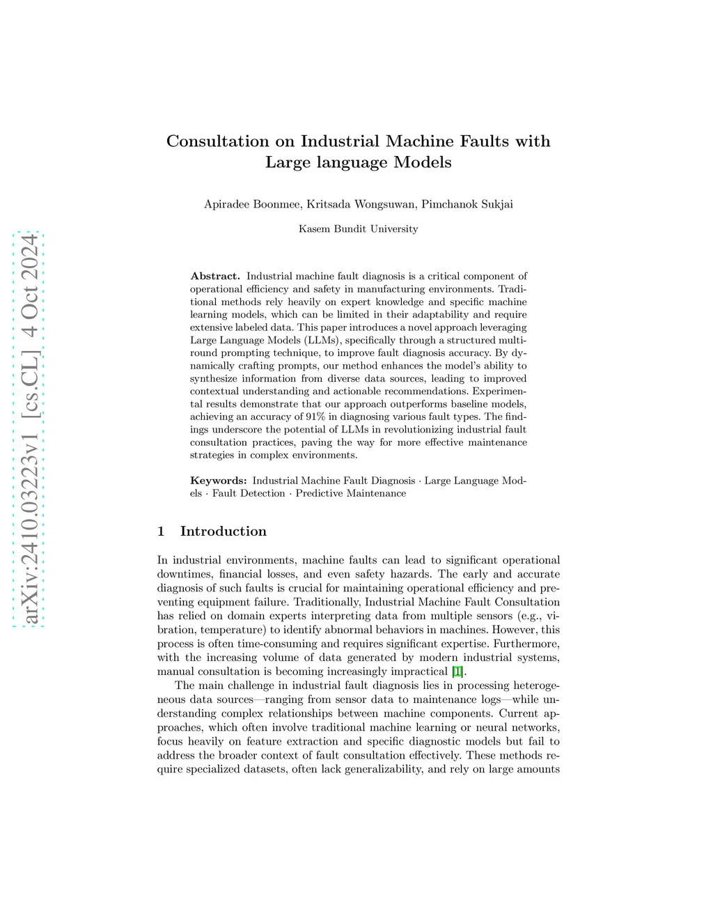Industrial machine fault diagnosis is a critical component of operational efficiency and safety in manufacturing environments. Traditional methods rely heavily on expert knowledge and specific machine learning models, which can be limited in their adaptability and require extensive labeled data. This paper introduces a novel approach leveraging Large Language Models (LLMs), specifically through a structured multi-round prompting technique, to improve fault diagnosis accuracy. By dynamically crafting prompts, our method enhances the model's ability to synthesize information from diverse data sources, leading to improved contextual understanding and actionable recommendations. Experimental results demonstrate that our approach outperforms baseline models, achieving an accuracy of 91% in diagnosing various fault types. The findings underscore the potential of LLMs in revolutionizing industrial fault consultation practices, paving the way for more effective maintenance strategies in complex environments.