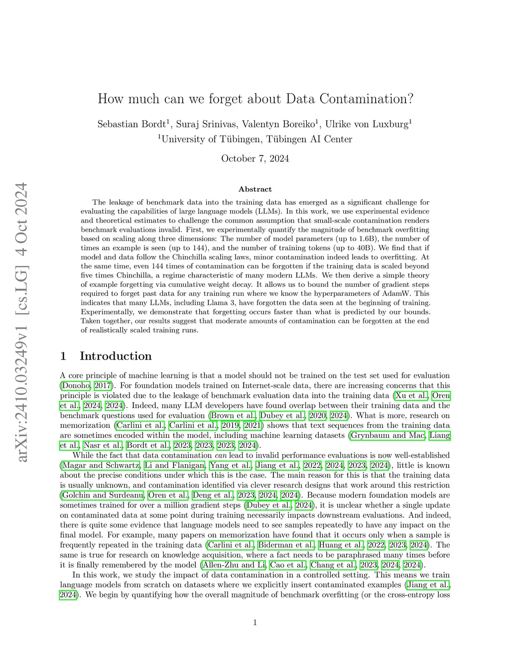 The leakage of benchmark data into the training data has emerged as a significant challenge for evaluating the capabilities of large language models (LLMs). In this work, we challenge the common assumption that small-scale contamination renders benchmark evaluations invalid. First, we experimentally quantify the magnitude of benchmark overfitting based on scaling along three dimensions: The number of model parameters (up to 1.6B), the number of times an example is seen (up to 144), and the number of training tokens (up to 40B). If model and data follow the Chinchilla scaling laws, minor contamination indeed leads to overfitting. At the same time, even 144 times of contamination can be forgotten if the training data is scaled beyond five times Chinchilla, a regime characteristic of many modern LLMs. Continual pre-training of OLMo-7B corroborates these results. Next, we study the impact of the weight decay parameter on example forgetting, showing that empirical forgetting occurs faster than the cumulative weight decay. This allows us to gauge the degree of example forgetting in large-scale training runs, indicating that many LLMs, including Lllama 3 405B, have forgotten the data seen at the beginning of training.