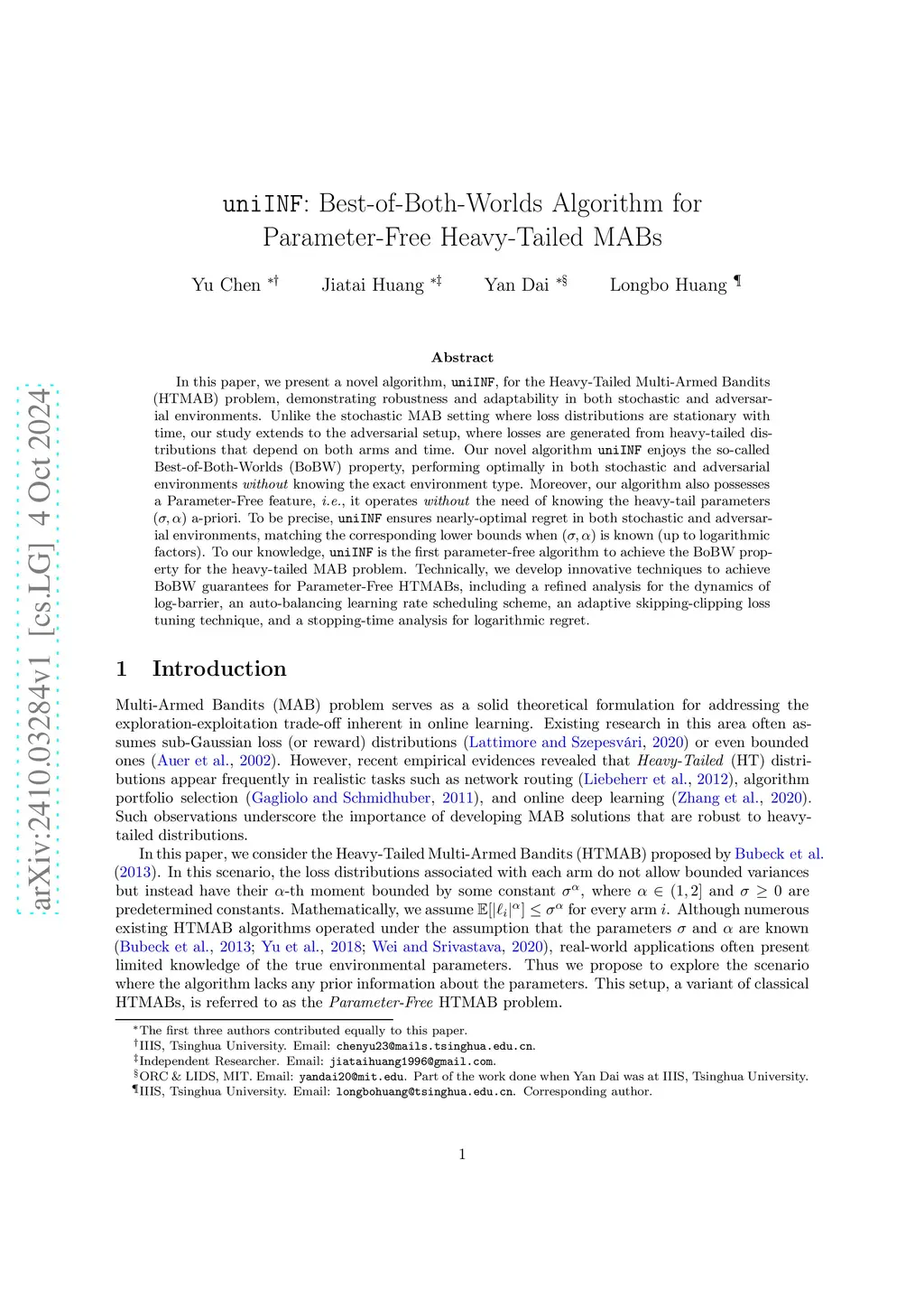 uniINF: Best-of-Both-Worlds Algorithm for Parameter-Free Heavy-Tailed MABs