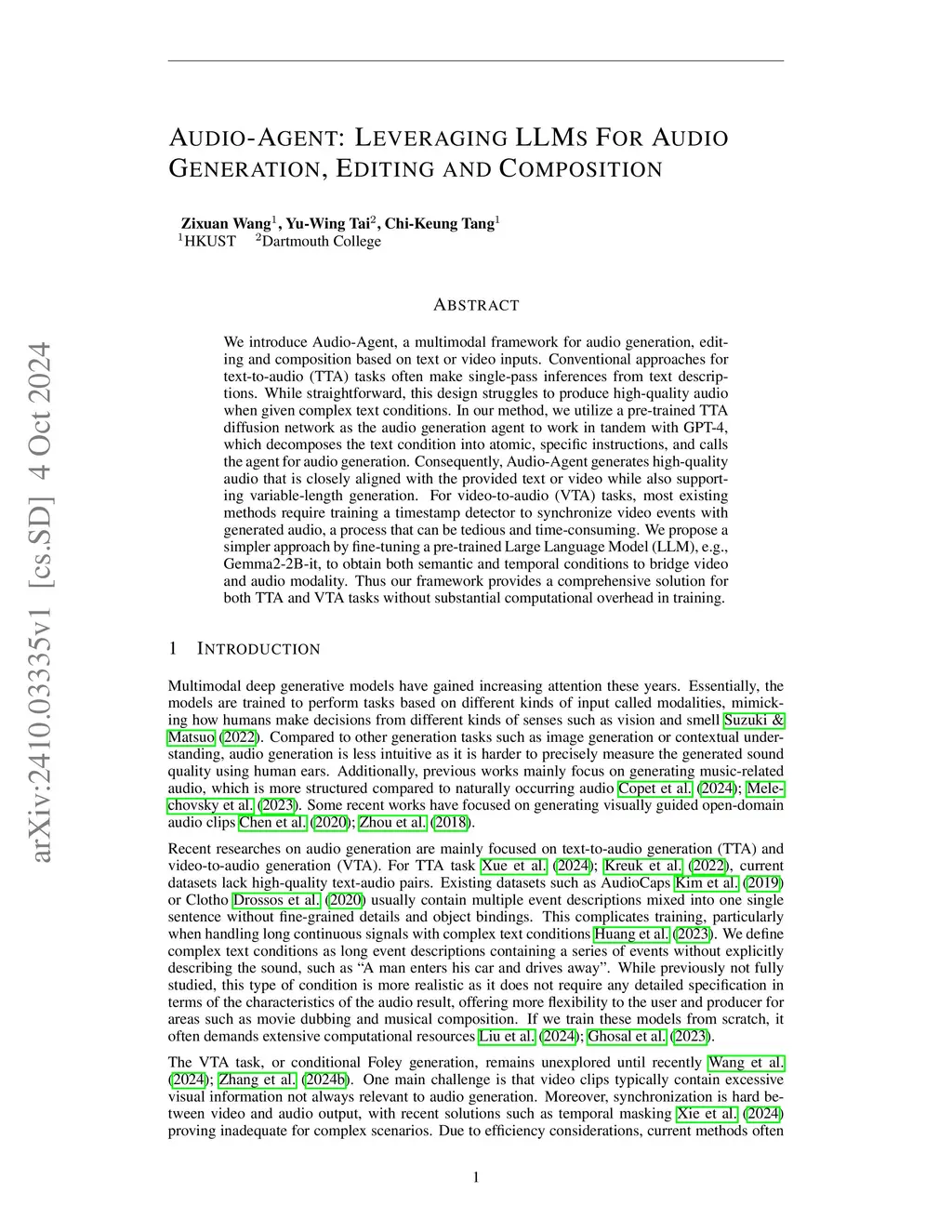 We introduce Audio-Agent, a multimodal framework for audio generation, editing and composition based on text or video inputs. Conventional approaches for text-to-audio (TTA) tasks often make single-pass inferences from text descriptions. While straightforward, this design struggles to produce high-quality audio when given complex text conditions. In our method, we utilize a pre-trained TTA diffusion network as the audio generation agent to work in tandem with GPT-4, which decomposes the text condition into atomic, specific instructions and calls the agent for audio generation. In doing so, Audio-Agent can generate high-quality audio that is closely aligned with the provided text or video exhibiting complex and multiple events, while supporting variable-length and variable-volume generation. For video-to-audio (VTA) tasks, most existing methods require training a timestamp detector to synchronize video events with the generated audio, a process that can be tedious and time-consuming. Instead, we propose a simpler approach by fine-tuning a pre-trained Large Language Model (LLM), e.g., Gemma2-2B-it, to obtain both semantic and temporal conditions that bridge the video and audio modality. Consequently, our framework contributes a comprehensive solution for both TTA and VTA tasks without substantial computational overhead in training.