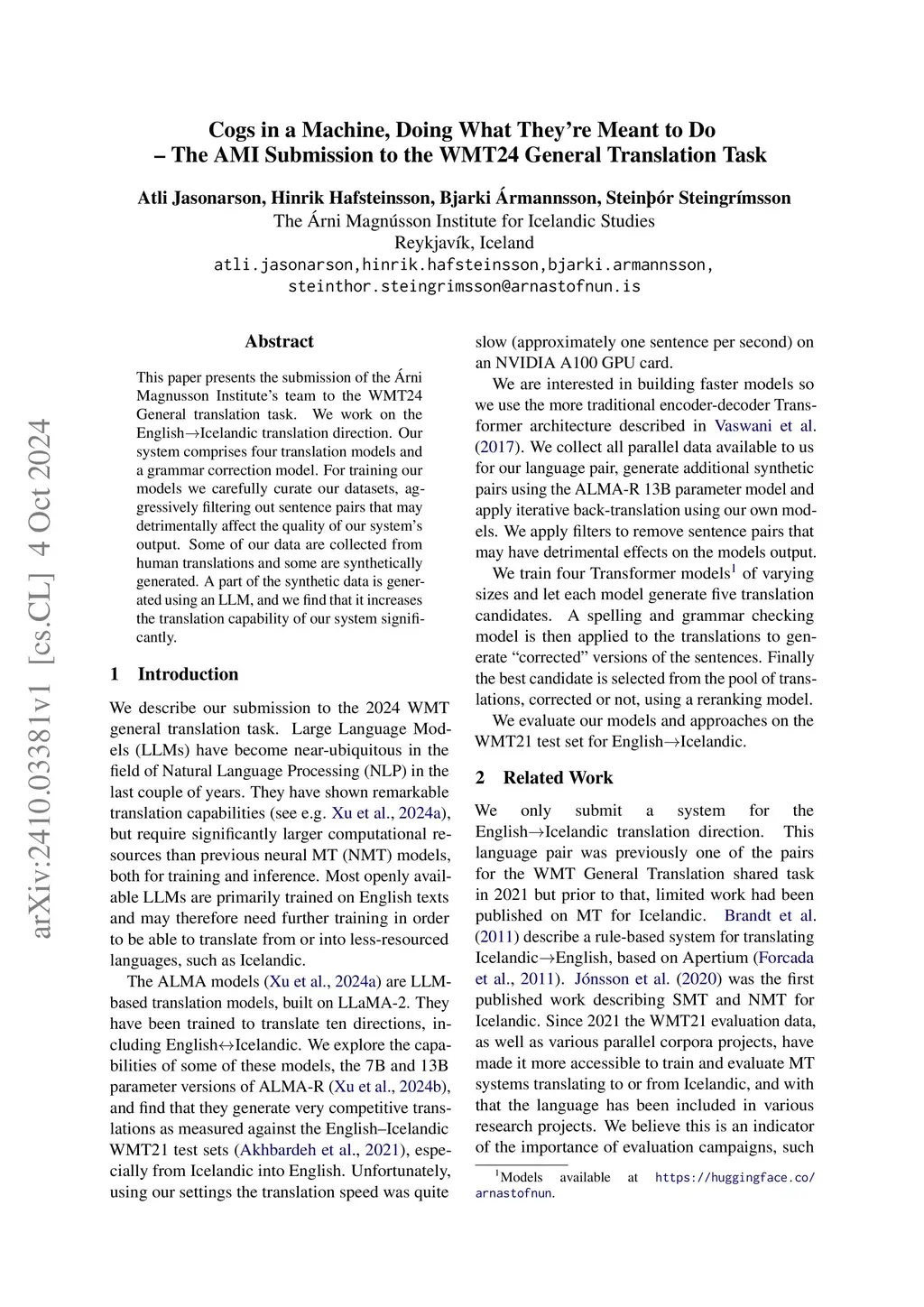 This paper presents the submission of the \Árni Magnusson Institute's team to the WMT24 General translation task. We work on the English->Icelandic translation direction. Our system comprises four translation models and a grammar correction model. For training our models we carefully curate our datasets, aggressively filtering out sentence pairs that may detrimentally affect the quality of our system's output. Some of our data are collected from human translations and some are synthetically generated. A part of the synthetic data is generated using an LLM, and we find that it increases the translation capability of our system significantly.