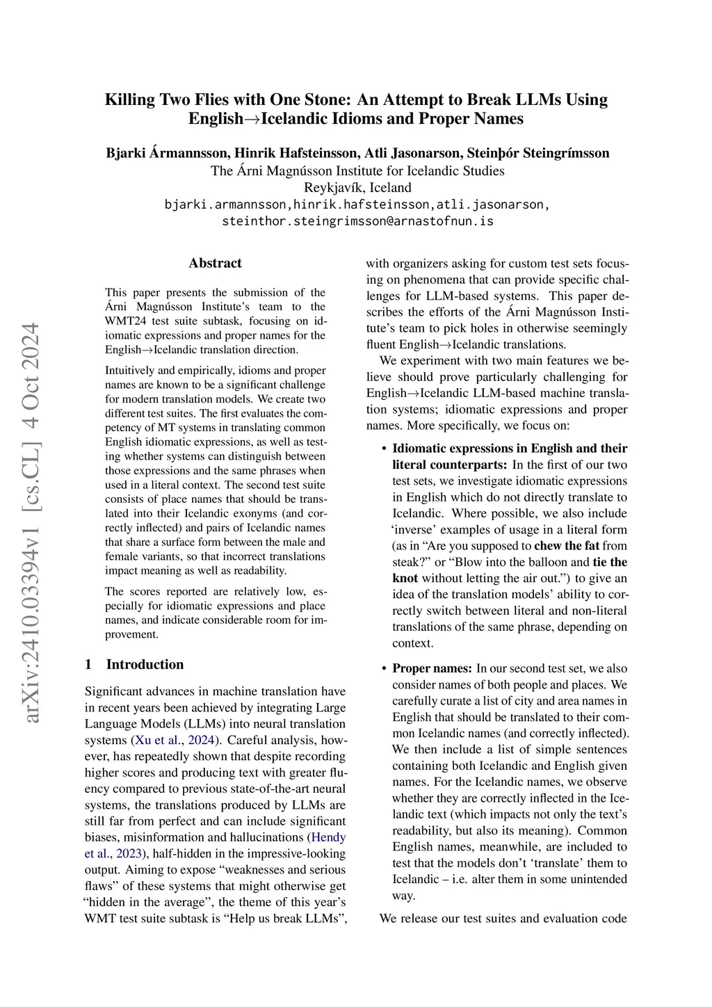 This paper presents the submission of the \Árni Magn\ússon Institute's team to the WMT24 test suite subtask, focusing on idiomatic expressions and proper names for the English->Icelandic translation direction. Intuitively and empirically, idioms and proper names are known to be a significant challenge for modern translation models. We create two different test suites. The first evaluates the competency of MT systems in translating common English idiomatic expressions, as well as testing whether systems can distinguish between those expressions and the same phrases when used in a literal context. The second test suite consists of place names that should be translated into their Icelandic exonyms (and correctly inflected) and pairs of Icelandic names that share a surface form between the male and female variants, so that incorrect translations impact meaning as well as readability. The scores reported are relatively low, especially for idiomatic expressions and place names, and indicate considerable room for improvement.