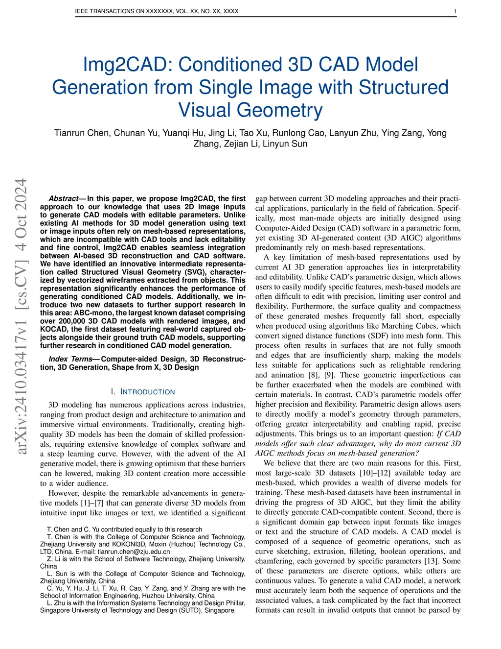 In this paper, we propose Img2CAD, the first approach to our knowledge that uses 2D image inputs to generate CAD models with editable parameters. Unlike existing AI methods for 3D model generation using text or image inputs often rely on mesh-based representations, which are incompatible with CAD tools and lack editability and fine control, Img2CAD enables seamless integration between AI-based 3D reconstruction and CAD software. We have identified an innovative intermediate representation called Structured Visual Geometry (SVG), characterized by vectorized wireframes extracted from objects. This representation significantly enhances the performance of generating conditioned CAD models. Additionally, we introduce two new datasets to further support research in this area: ABC-mono, the largest known dataset comprising over 200,000 3D CAD models with rendered images, and KOCAD, the first dataset featuring real-world captured objects alongside their ground truth CAD models, supporting further research in conditioned CAD model generation.