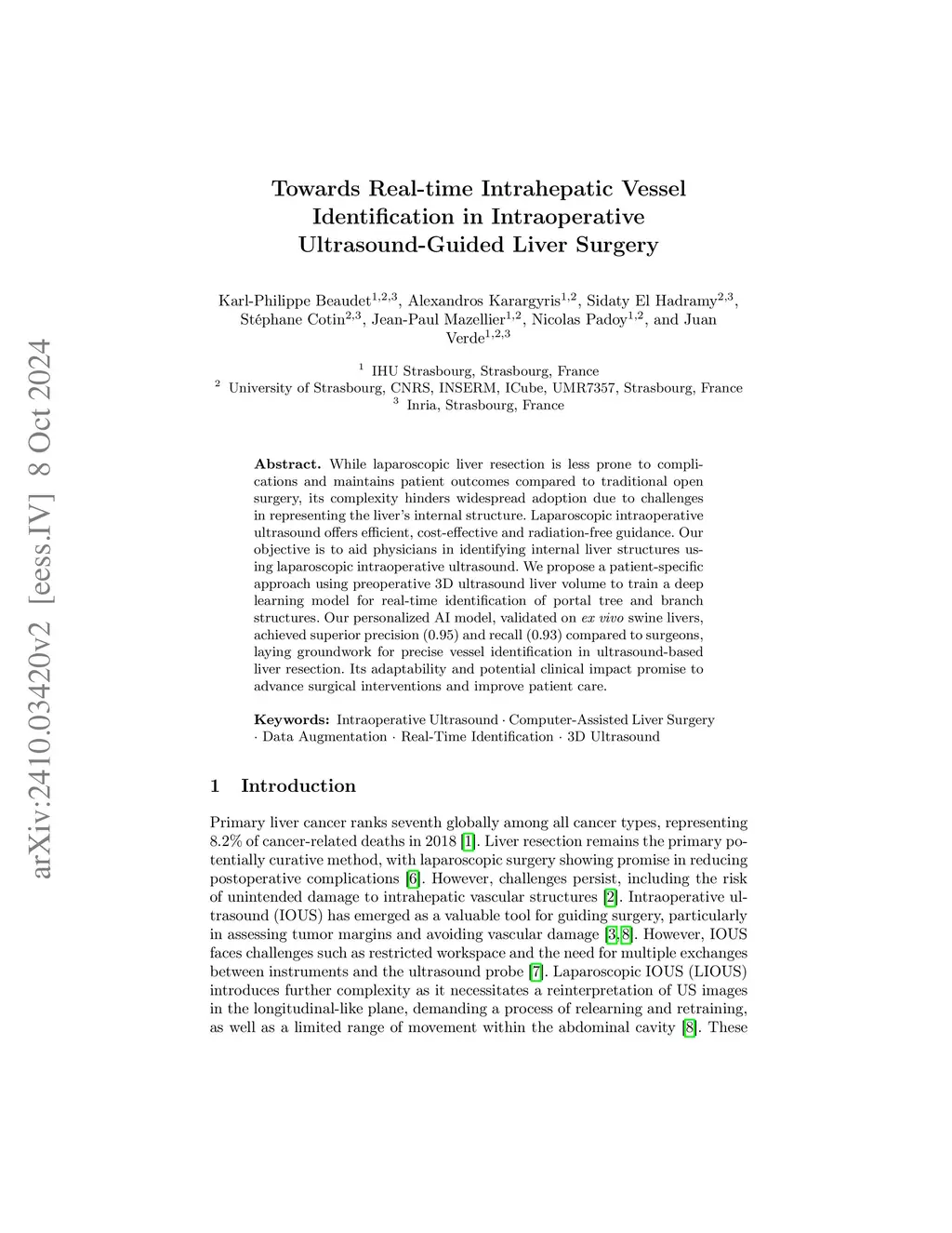 While laparoscopic liver resection is less prone to complications and maintains patient outcomes compared to traditional open surgery, its complexity hinders widespread adoption due to challenges in representing the liver's internal structure. Laparoscopic intraoperative ultrasound offers efficient, cost-effective and radiation-free guidance. Our objective is to aid physicians in identifying internal liver structures using laparoscopic intraoperative ultrasound. We propose a patient-specific approach using preoperative 3D ultrasound liver volume to train a deep learning model for real-time identification of portal tree and branch structures. Our personalized AI model, validated on ex vivo swine livers, achieved superior precision (0.95) and recall (0.93) compared to surgeons, laying groundwork for precise vessel identification in ultrasound-based liver resection. Its adaptability and potential clinical impact promise to advance surgical interventions and improve patient care.