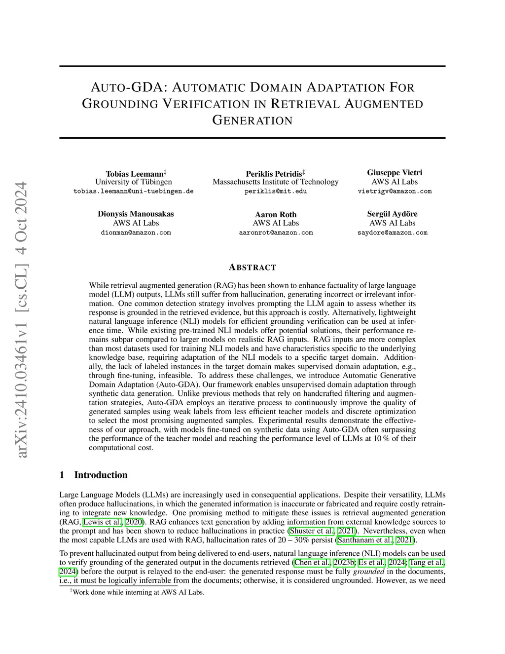 While retrieval-augmented generation (RAG) has been shown to enhance factuality of large language model (LLM) outputs, LLMs still suffer from hallucination, generating incorrect or irrelevant information. A common detection strategy involves prompting the LLM again to assess whether its response is grounded in the retrieved evidence, but this approach is costly. Alternatively, lightweight natural language inference (NLI) models for efficient grounding verification can be used at inference time. While existing pre-trained NLI models offer potential solutions, their performance remains subpar compared to larger models on realistic RAG inputs. RAG inputs are more complex than most datasets used for training NLI models and have characteristics specific to the underlying knowledge base, requiring adaptation of the NLI models to a specific target domain. Additionally, the lack of labeled instances in the target domain makes supervised domain adaptation, e.g., through fine-tuning, infeasible. To address these challenges, we introduce Automatic Generative Domain Adaptation (Auto-GDA). Our framework enables unsupervised domain adaptation through synthetic data generation. Unlike previous methods that rely on handcrafted filtering and augmentation strategies, Auto-GDA employs an iterative process to continuously improve the quality of generated samples using weak labels from less efficient teacher models and discrete optimization to select the most promising augmented samples. Experimental results demonstrate the effectiveness of our approach, with models fine-tuned on synthetic data using Auto-GDA often surpassing the performance of the teacher model and reaching the performance level of LLMs at 10% of their computational cost.