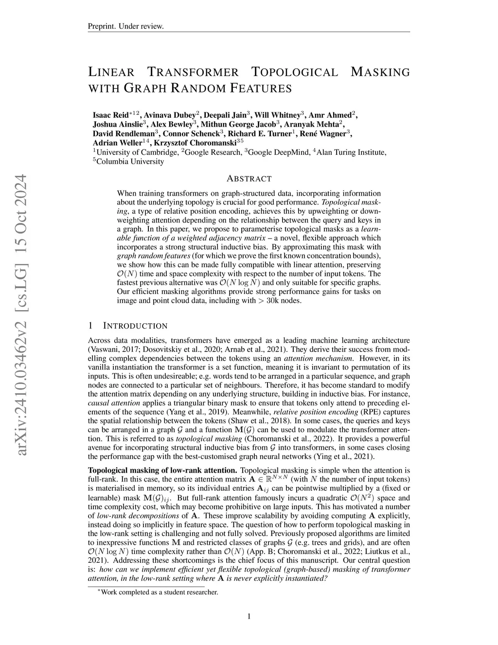 Linear Transformer Topological Masking with Graph Random Features