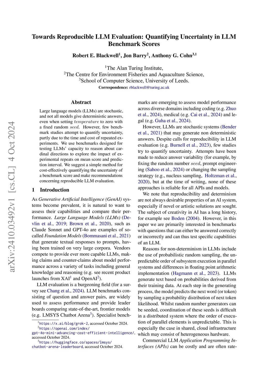 Large language models (LLMs) are stochastic, and not all models give deterministic answers, even when setting temperature to zero with a fixed random seed. However, few benchmark studies attempt to quantify uncertainty, partly due to the time and cost of repeated experiments. We use benchmarks designed for testing LLMs' capacity to reason about cardinal directions to explore the impact of experimental repeats on mean score and prediction interval. We suggest a simple method for cost-effectively quantifying the uncertainty of a benchmark score and make recommendations concerning reproducible LLM evaluation.