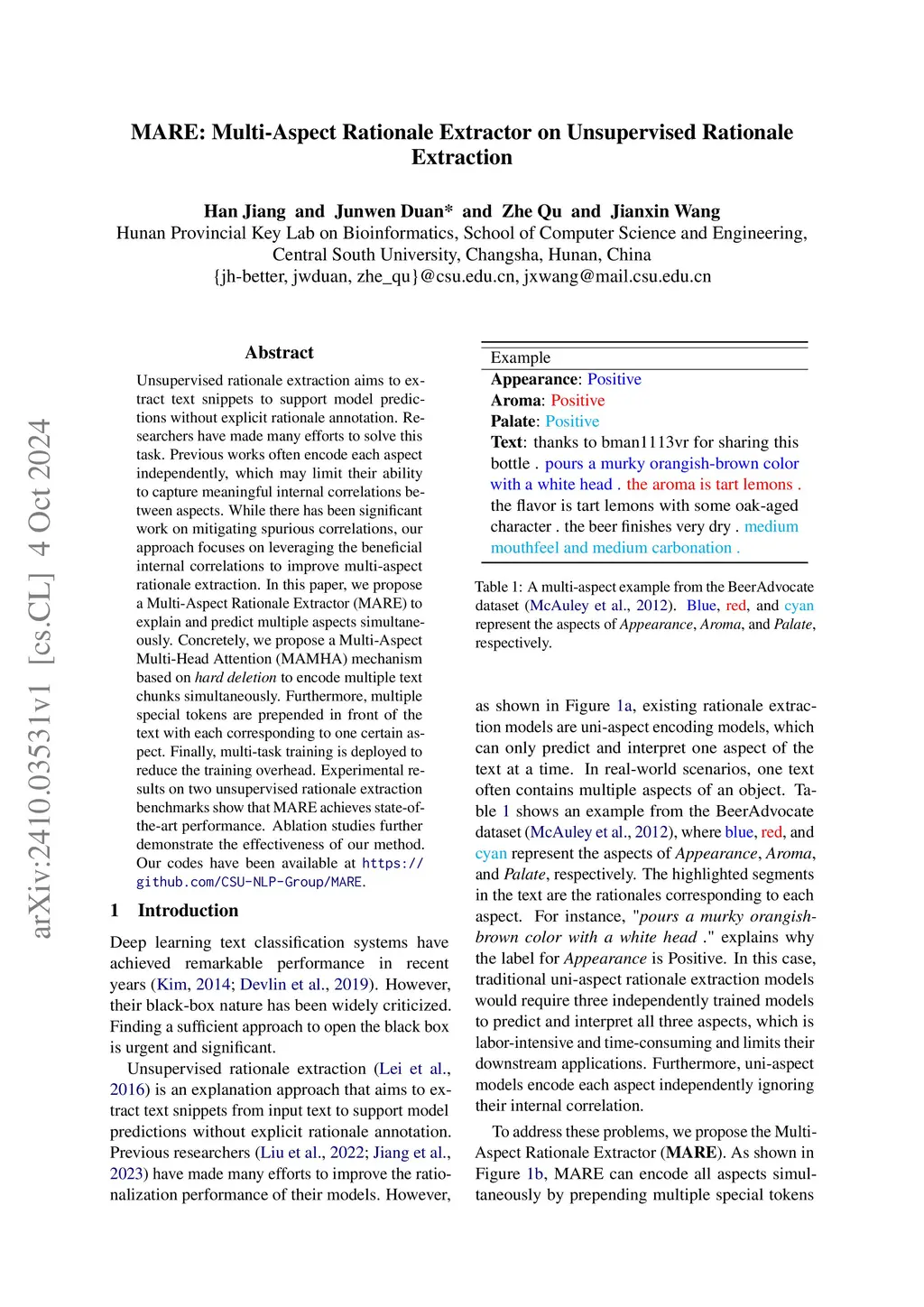 MARE: Multi-Aspect Rationale Extractor on Unsupervised Rationale