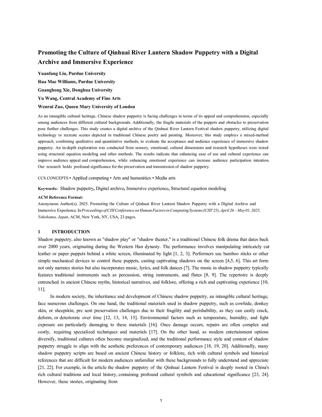 As an intangible cultural heritage, Chinese shadow puppetry is facing challenges in terms of its appeal and comprehension, especially among audiences from different cultural backgrounds. Additionally, the fragile materials of the puppets and obstacles to preservation pose further challenges. This study creates a digital archive of the Qinhuai River Lantern Festival shadow puppetry, utilizing digital technology to recreate scenes depicted in traditional Chinese poetry and painting. Moreover, this study employs a mixed-method approach, combining qualitative and quantitative methods, to evaluate the acceptance and audience experience of immersive shadow puppetry. An in-depth exploration was conducted from sensory, emotional, cultural dimensions and research hypotheses were tested using structural equation modeling and other methods. The results indicate that enhancing ease of use and cultural experience can improve audience appeal and comprehension, while enhancing emotional experience can increase audience participation intention. Our research holds profound significance for the preservation and transmission of shadow puppetry.