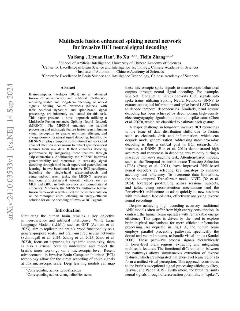 Multiscale fusion enhanced spiking neural network for invasive BCI