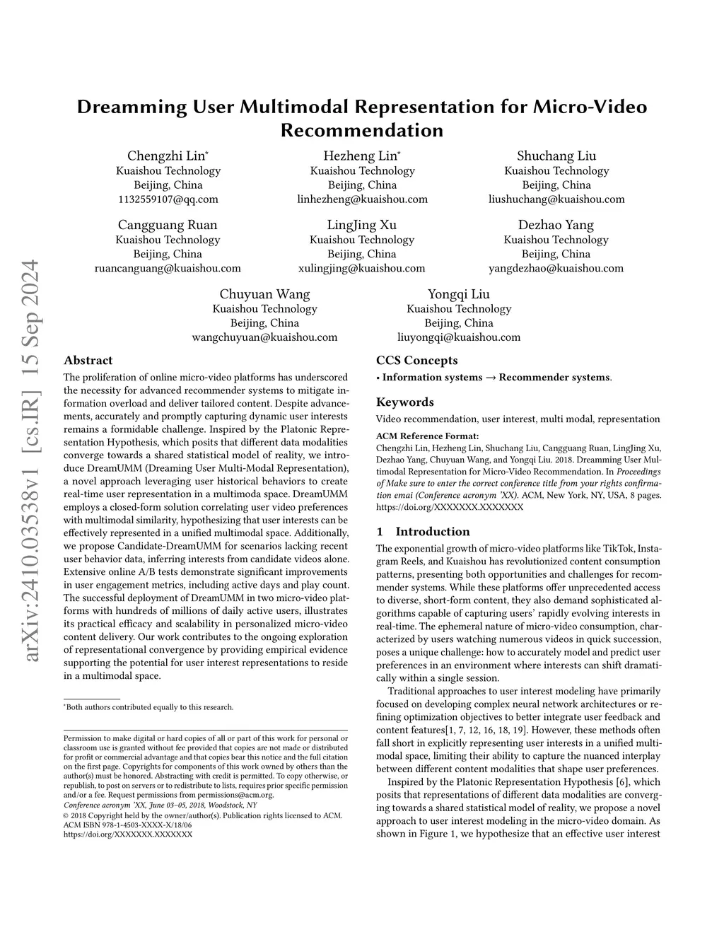 The proliferation of online micro-video platforms has underscored the necessity for advanced recommender systems to mitigate information overload and deliver tailored content. Despite advancements, accurately and promptly capturing dynamic user interests remains a formidable challenge. Inspired by the Platonic Representation Hypothesis, which posits that different data modalities converge towards a shared statistical model of reality, we introduce DreamUMM (Dreaming User Multi-Modal Representation), a novel approach leveraging user historical behaviors to create real-time user representation in a multimoda space. DreamUMM employs a closed-form solution correlating user video preferences with multimodal similarity, hypothesizing that user interests can be effectively represented in a unified multimodal space. Additionally, we propose Candidate-DreamUMM for scenarios lacking recent user behavior data, inferring interests from candidate videos alone. Extensive online A/B tests demonstrate significant improvements in user engagement metrics, including active days and play count. The successful deployment of DreamUMM in two micro-video platforms with hundreds of millions of daily active users, illustrates its practical efficacy and scalability in personalized micro-video content delivery. Our work contributes to the ongoing exploration of representational convergence by providing empirical evidence supporting the potential for user interest representations to reside in a multimodal space.