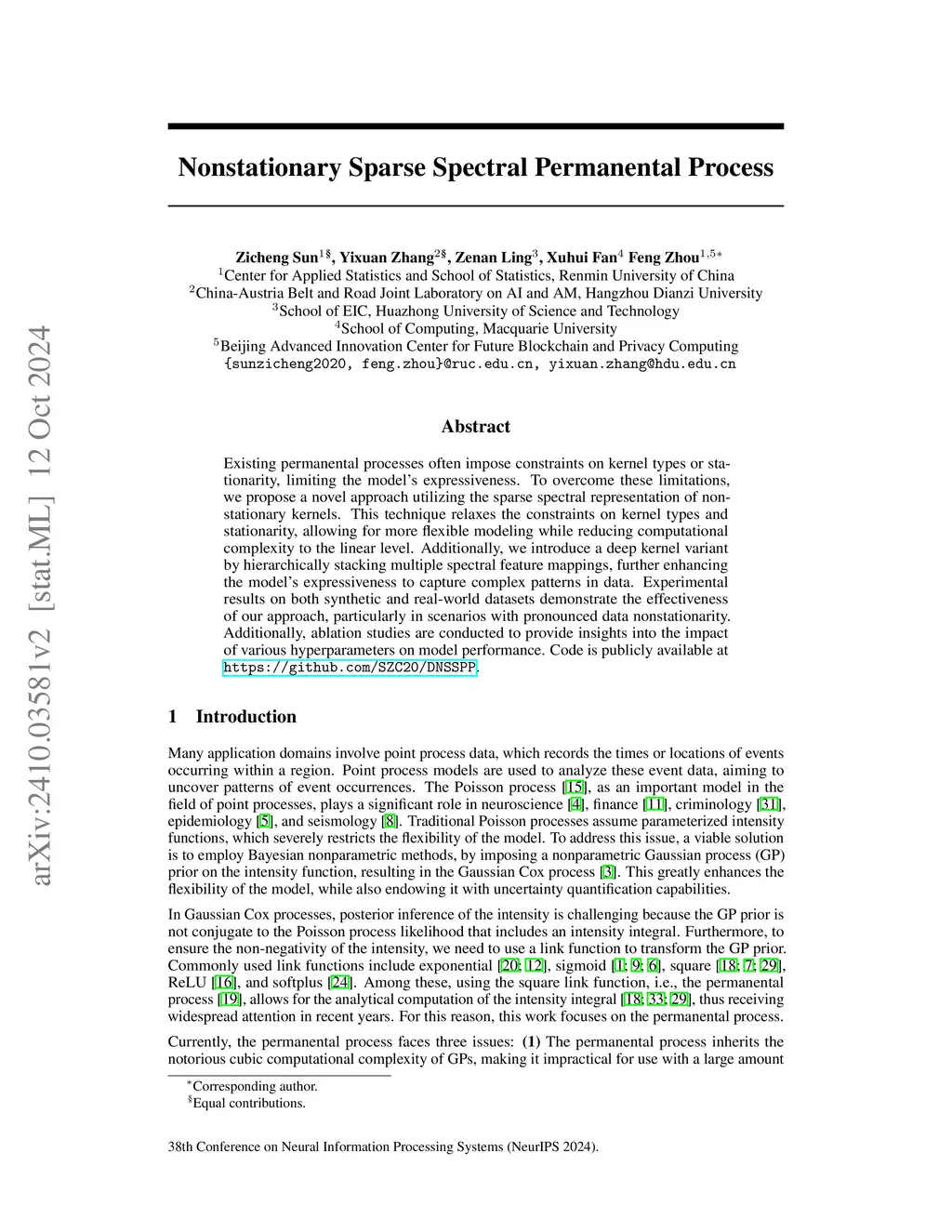 Nonstationary Sparse Spectral Permanental Process