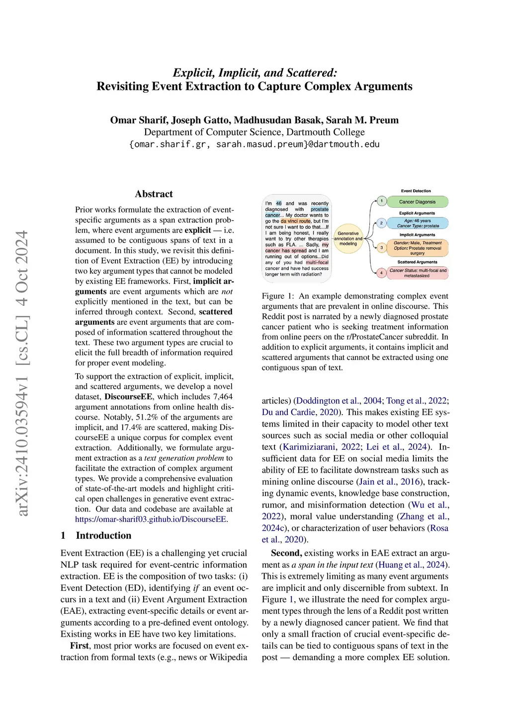 Prior works formulate the extraction of event-specific arguments as a span extraction problem, where event arguments are explicit -- i.e. assumed to be contiguous spans of text in a document. In this study, we revisit this definition of Event Extraction (EE) by introducing two key argument types that cannot be modeled by existing EE frameworks. First, implicit arguments are event arguments which are not explicitly mentioned in the text, but can be inferred through context. Second, scattered arguments are event arguments that are composed of information scattered throughout the text. These two argument types are crucial to elicit the full breadth of information required for proper event modeling. To support the extraction of explicit, implicit, and scattered arguments, we develop a novel dataset, DiscourseEE, which includes 7,464 argument annotations from online health discourse. Notably, 51.2% of the arguments are implicit, and 17.4% are scattered, making DiscourseEE a unique corpus for complex event extraction. Additionally, we formulate argument extraction as a text generation problem to facilitate the extraction of complex argument types. We provide a comprehensive evaluation of state-of-the-art models and highlight critical open challenges in generative event extraction. Our data and codebase are available at https://omar-sharif03.github.io/DiscourseEE.
