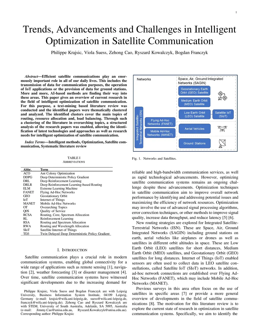 Efficient satellite communications play an enormously important role in all of our daily lives. This includes the transmission of data for communication purposes, the operation of IoT applications or the provision of data for ground stations. More and more, AI-based methods are finding their way into these areas. This paper gives an overview of current research in the field of intelligent optimization of satellite communication. For this purpose, a text-mining based literature review was conducted and the identified papers were thematically clustered and analyzed. The identified clusters cover the main topics of routing, resource allocation and, load balancing. Through such a clustering of the literature in overarching topics, a structured analysis of the research papers was enabled, allowing the identification of latest technologies and approaches as well as research needs for intelligent optimization of satellite communication.