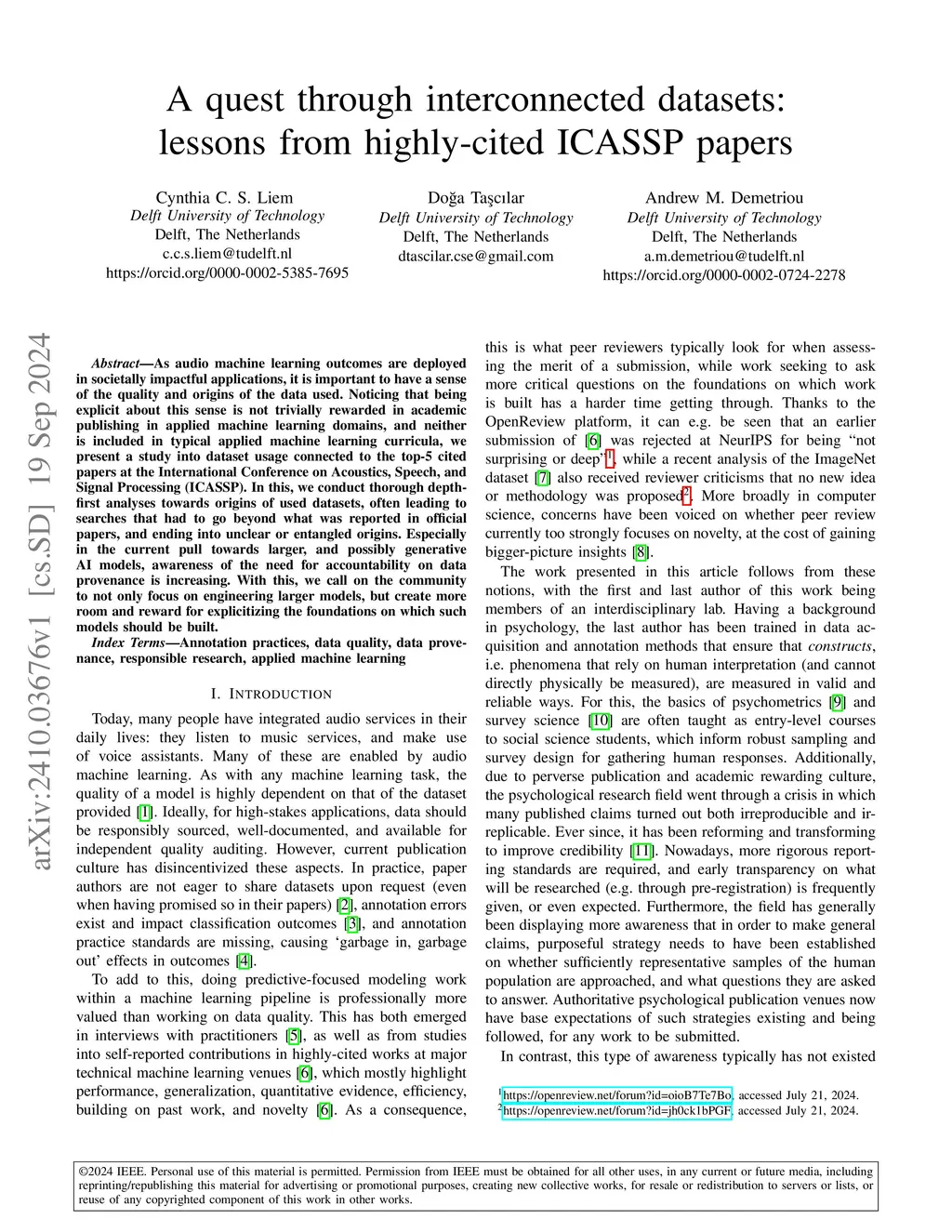 As audio machine learning outcomes are deployed in societally impactful applications, it is important to have a sense of the quality and origins of the data used. Noticing that being explicit about this sense is not trivially rewarded in academic publishing in applied machine learning domains, and neither is included in typical applied machine learning curricula, we present a study into dataset usage connected to the top-5 cited papers at the International Conference on Acoustics, Speech, and Signal Processing (ICASSP). In this, we conduct thorough depth-first analyses towards origins of used datasets, often leading to searches that had to go beyond what was reported in official papers, and ending into unclear or entangled origins. Especially in the current pull towards larger, and possibly generative AI models, awareness of the need for accountability on data provenance is increasing. With this, we call on the community to not only focus on engineering larger models, but create more room and reward for explicitizing the foundations on which such models should be built.