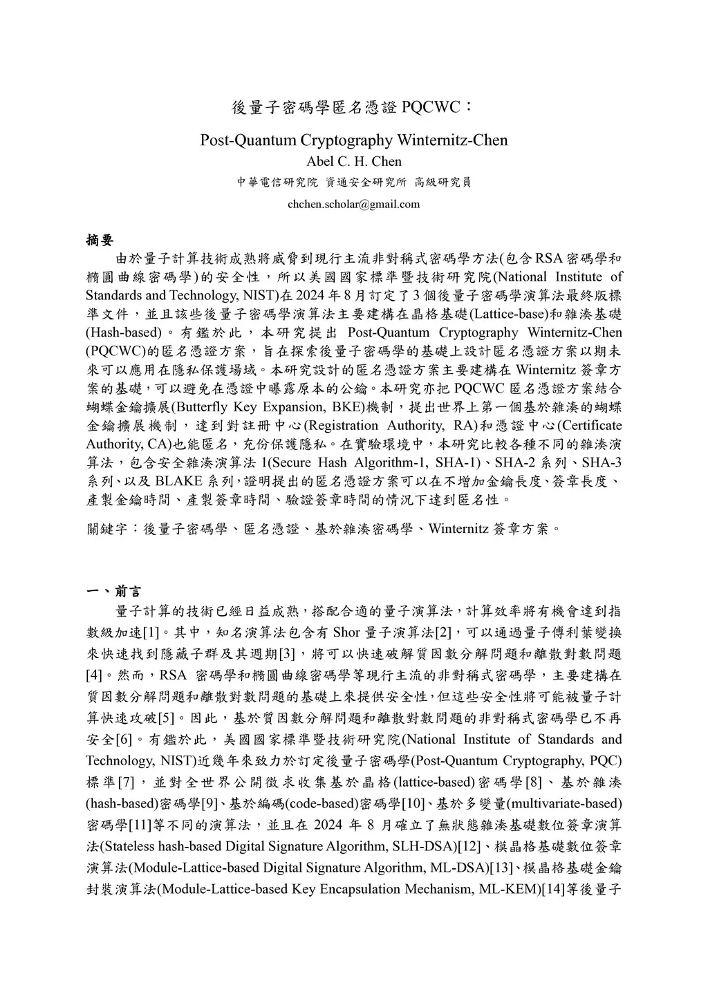 As quantum computing technology matures, it poses a threat to the security of mainstream asymmetric cryptographic methods. In response, the National Institute of Standards and Technology released the final version of post-quantum cryptographic (PQC) algorithm standards in August 2024. These post-quantum cryptographic algorithms are primarily based on lattice-based and hash-based cryptography. Therefore, this study proposes the Post-Quantum Cryptography Winternitz-Chen (PQCWC) anonymous scheme, aimed at exploring the design of anonymous schemes based on PQC for future applications in privacy protection. The anonymous scheme designed in this study is mainly built on the Winternitz signature scheme, which can prevent the original public key from being exposed in the certificate. Furthermore, the PQCWC anonymous scheme integrates the butterfly key expansion mechanism, proposing the first hash-based butterfly key expansion mechanism in the world, achieving anonymity for both the registration authority and the certificate authority, thereby fully protecting privacy. In the experimental environment, this study compares various hash algorithms, including Secure Hash Algorithm-1 (SHA-1), the SHA-2 series, the SHA-3 series, and the BLAKE series. The results demonstrate that the proposed anonymous scheme can achieve anonymity without increasing key length, signature length, key generation time, signature generation time, or signature verification time.