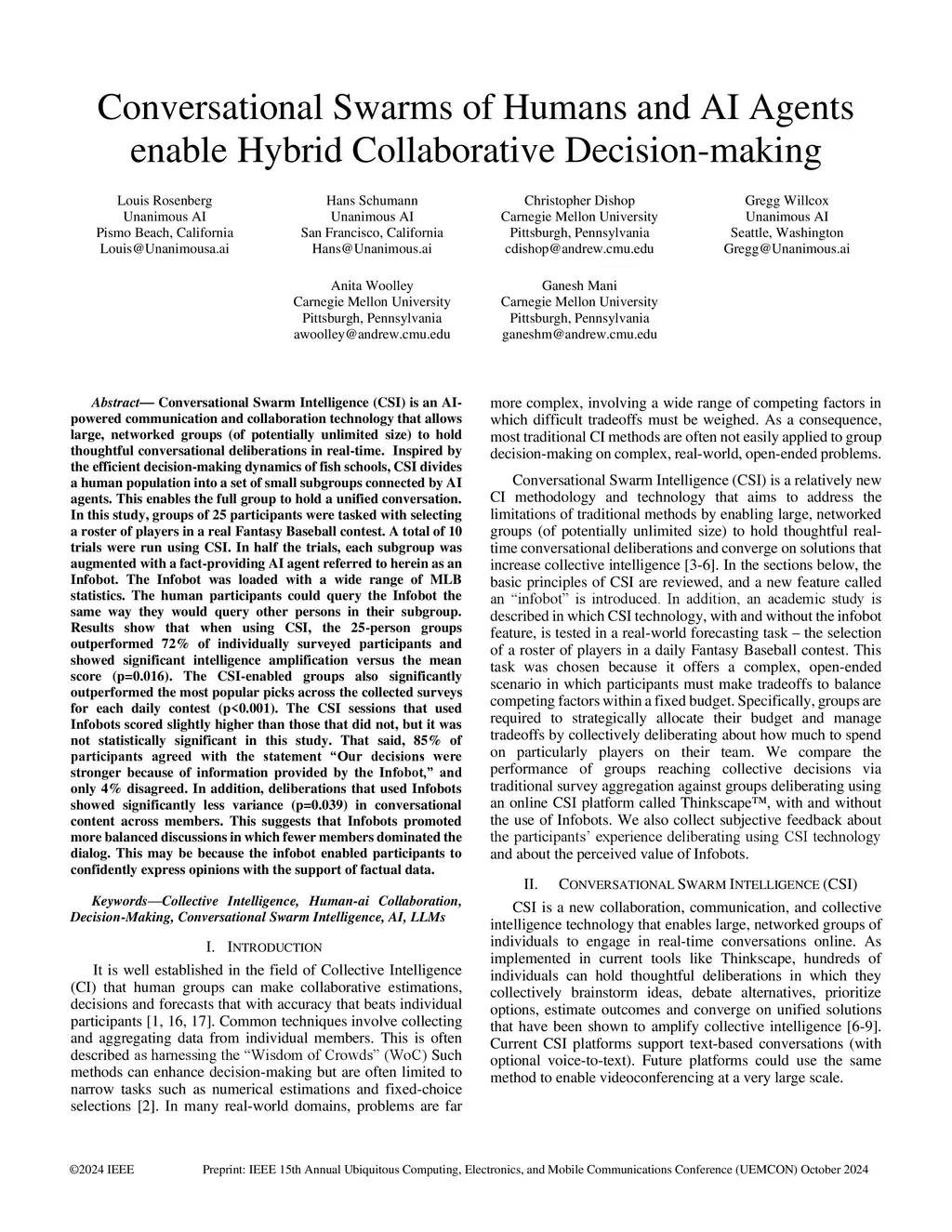 Conversational Swarm Intelligence (CSI) is an AI-powered communication and collaboration technology that allows large, networked groups (of potentially unlimited size) to hold thoughtful conversational deliberations in real-time. Inspired by the efficient decision-making dynamics of fish schools, CSI divides a human population into a set of small subgroups connected by AI agents. This enables the full group to hold a unified conversation. In this study, groups of 25 participants were tasked with selecting a roster of players in a real Fantasy Baseball contest. A total of 10 trials were run using CSI. In half the trials, each subgroup was augmented with a fact-providing AI agent referred to herein as an Infobot. The Infobot was loaded with a wide range of MLB statistics. The human participants could query the Infobot the same way they would query other persons in their subgroup. Results show that when using CSI, the 25-person groups outperformed 72% of individually surveyed participants and showed significant intelligence amplification versus the mean score (p=0.016). The CSI-enabled groups also significantly outperformed the most popular picks across the collected surveys for each daily contest (p<0.001). The CSI sessions that used Infobots scored slightly higher than those that did not, but it was not statistically significant in this study. That said, 85% of participants agreed with the statement Óur decisions were stronger because of information provided by the Infobot' and only 4% disagreed. In addition, deliberations that used Infobots showed significantly less variance (p=0.039) in conversational content across members. This suggests that Infobots promoted more balanced discussions in which fewer members dominated the dialog. This may be because the infobot enabled participants to confidently express opinions with the support of factual data