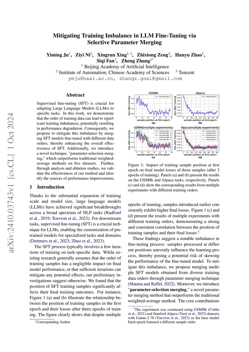 Supervised fine-tuning (SFT) is crucial for adapting Large Language Models (LLMs) to specific tasks. In this work, we demonstrate that the order of training data can lead to significant training imbalances, potentially resulting in performance degradation. Consequently, we propose to mitigate this imbalance by merging SFT models fine-tuned with different data orders, thereby enhancing the overall effectiveness of SFT. Additionally, we introduce a novel technique, "parameter-selection merging," which outperforms traditional weighted-average methods on five datasets. Further, through analysis and ablation studies, we validate the effectiveness of our method and identify the sources of performance improvements.