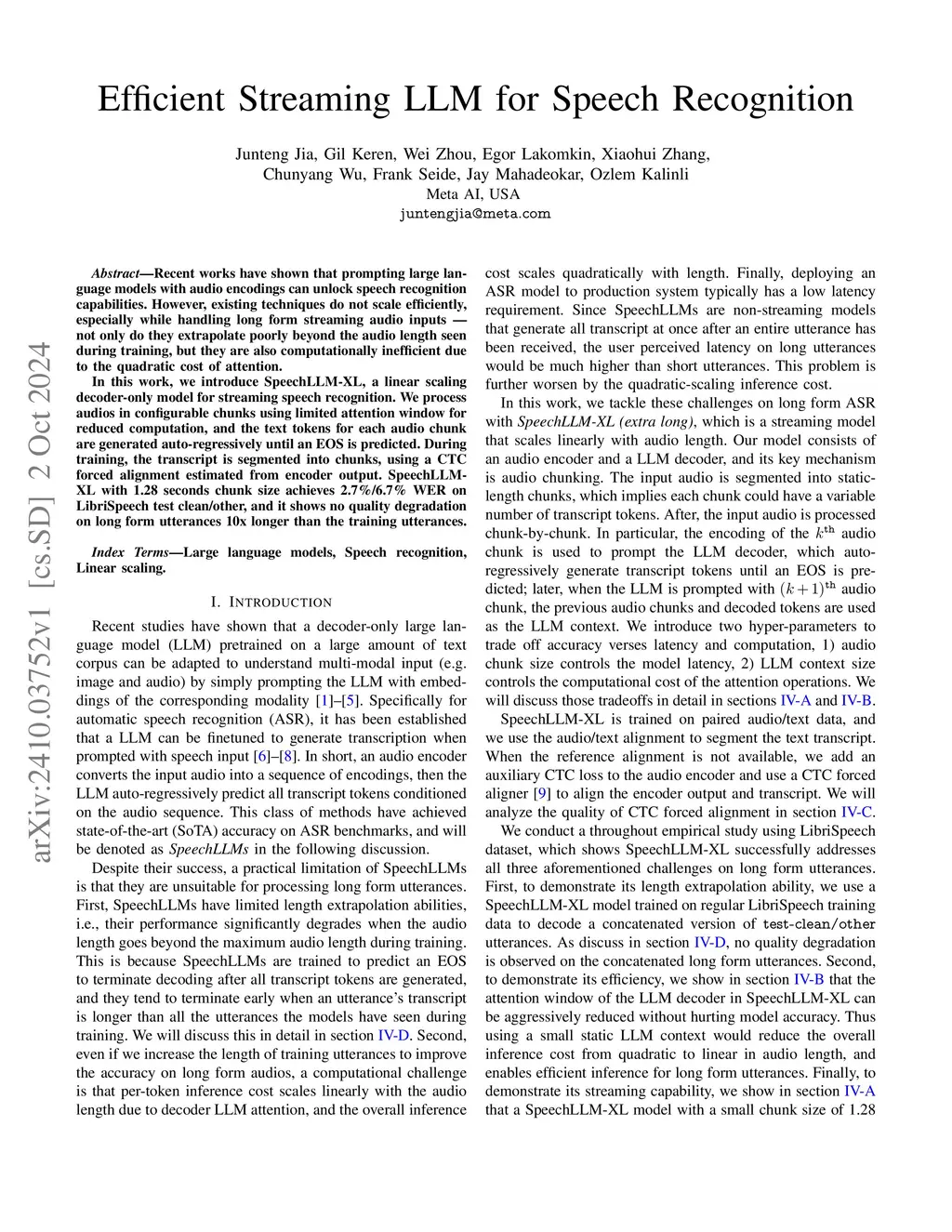Recent works have shown that prompting large language models with audio encodings can unlock speech recognition capabilities. However, existing techniques do not scale efficiently, especially while handling long form streaming audio inputs -- not only do they extrapolate poorly beyond the audio length seen during training, but they are also computationally inefficient due to the quadratic cost of attention. In this work, we introduce SpeechLLM-XL, a linear scaling decoder-only model for streaming speech recognition. We process audios in configurable chunks using limited attention window for reduced computation, and the text tokens for each audio chunk are generated auto-regressively until an EOS is predicted. During training, the transcript is segmented into chunks, using a CTC forced alignment estimated from encoder output. SpeechLLM-XL with 1.28 seconds chunk size achieves 2.7%/6.7% WER on LibriSpeech test clean/other, and it shows no quality degradation on long form utterances 10x longer than the training utterances.