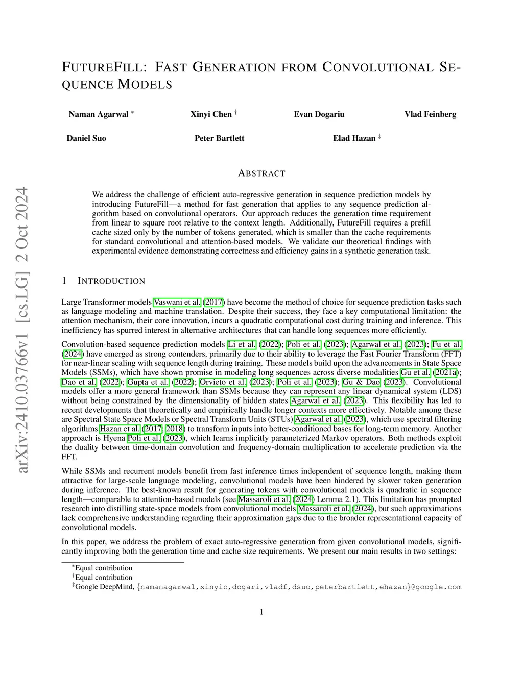 We address the challenge of efficient auto-regressive generation in sequence prediction models by introducing FutureFill, a general-purpose fast generation method for any sequence prediction algorithm based on convolutional operators. FutureFill reduces generation time from quadratic to quasilinear in the context length. Moreover, when generating from a prompt, it requires a prefill cache whose size grows only with the number of tokens to be generated, often much smaller than the caches required by standard convolutional or attention based models. We validate our theoretical claims with experiments on synthetic tasks and demonstrate substantial efficiency gains when generating from a deep convolutional sequence prediction model.