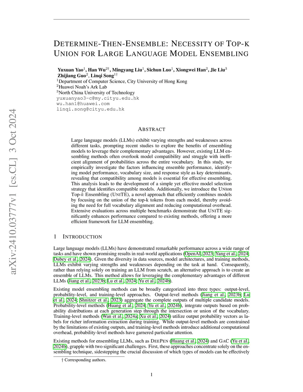 Large language models (LLMs) exhibit varying strengths and weaknesses across different tasks, prompting recent studies to explore the benefits of ensembling models to leverage their complementary advantages. However, existing LLM ensembling methods often overlook model compatibility and struggle with inefficient alignment of probabilities across the entire vocabulary. In this study, we empirically investigate the factors influencing ensemble performance, identifying model performance, vocabulary size, and response style as key determinants, revealing that compatibility among models is essential for effective ensembling. This analysis leads to the development of a simple yet effective model selection strategy that identifies compatible models. Additionally, we introduce the \textsc{Uni}on \textsc{T}op- \textsc{E}nsembling (\textsc{UniTE}), a novel approach that efficiently combines models by focusing on the union of the top-k tokens from each model, thereby avoiding the need for full vocabulary alignment and reducing computational overhead. Extensive evaluations across multiple benchmarks demonstrate that \textsc{UniTE} significantly enhances performance compared to existing methods, offering a more efficient framework for LLM ensembling.