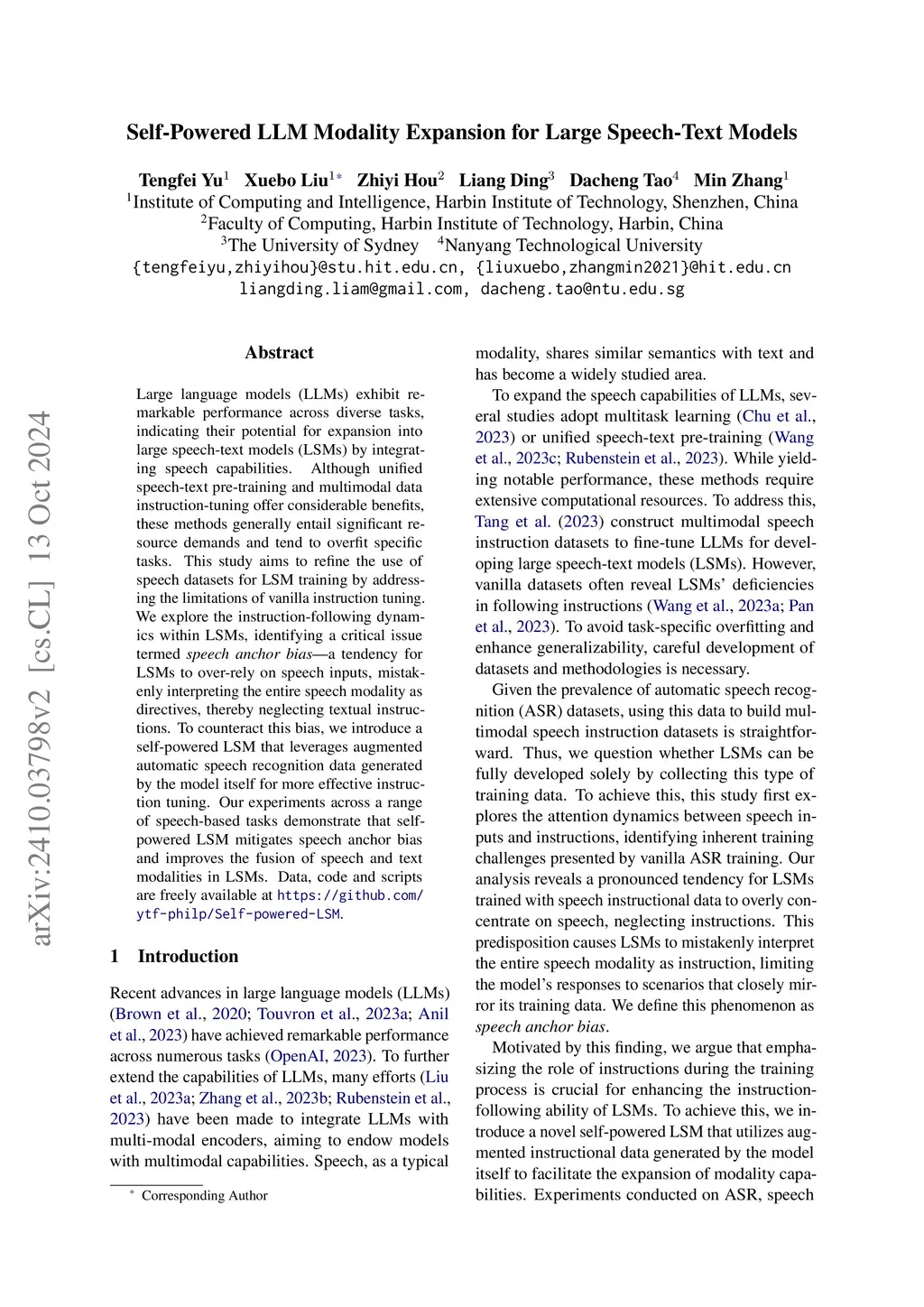 Large language models (LLMs) exhibit remarkable performance across diverse tasks, indicating their potential for expansion into large speech-text models (LSMs) by integrating speech capabilities. Although unified speech-text pre-training and multimodal data instruction-tuning offer considerable benefits, these methods generally entail significant resource demands and tend to overfit specific tasks. This study aims to refine the use of speech datasets for LSM training by addressing the limitations of vanilla instruction tuning. We explore the instruction-following dynamics within LSMs, identifying a critical issue termed speech anchor bias-a tendency for LSMs to over-rely on speech inputs, mistakenly interpreting the entire speech modality as directives, thereby neglecting textual instructions. To counteract this bias, we introduce a self-powered LSM that leverages augmented automatic speech recognition data generated by the model itself for more effective instruction tuning. Our experiments across a range of speech-based tasks demonstrate that self-powered LSM mitigates speech anchor bias and improves the fusion of speech and text modalities in LSMs. Data, code and scripts are freely available at https://github.com/ytf-philp/Self-powered-LSM.
